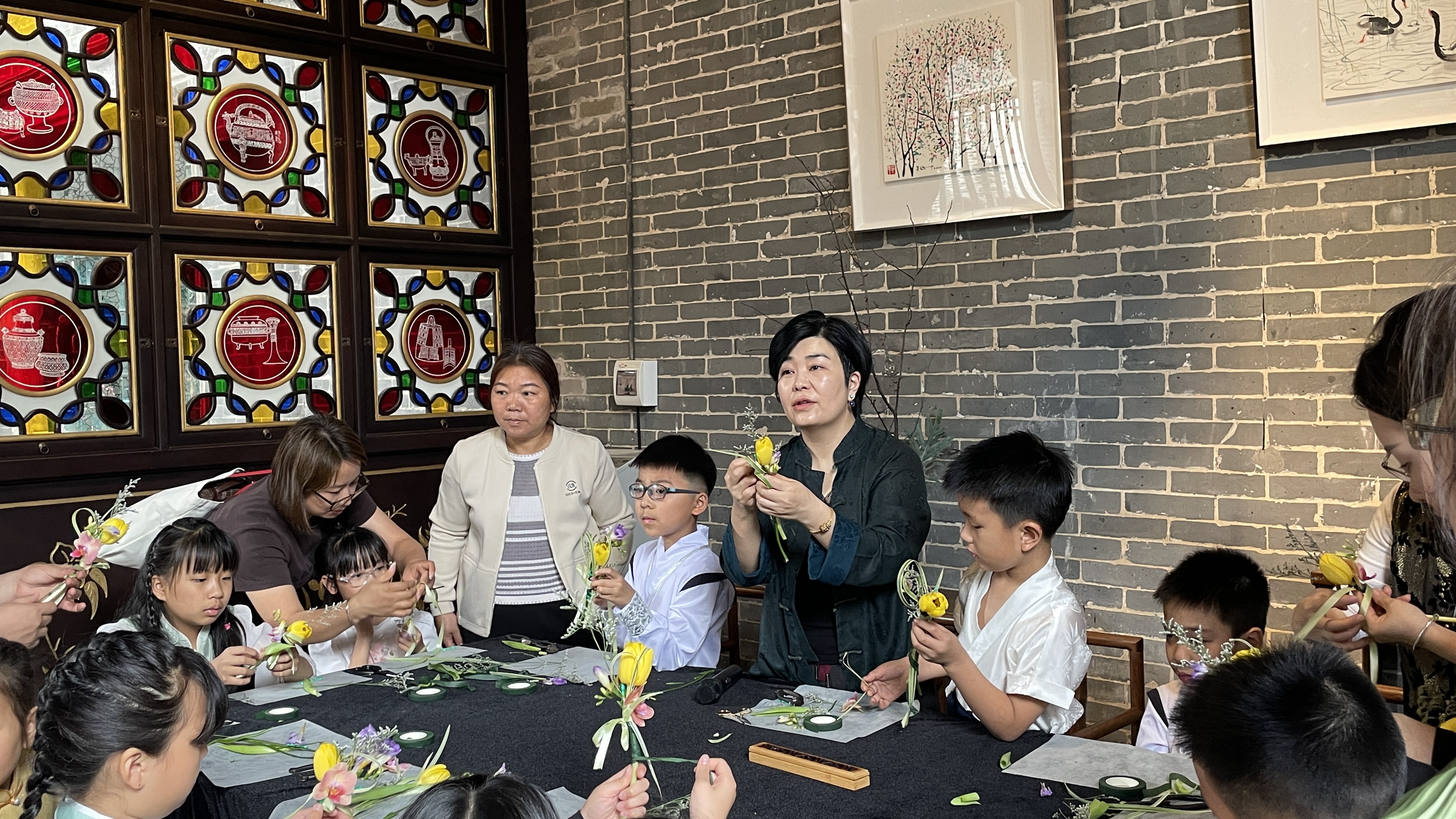 活动现场花香萦绕、古韵盎然,孩子们围坐成圈,在专业老师的细致指导下,沉浸式学习传统插花技艺。大家不仅认识了郁金香、紫莺、兰草、小苍兰等多款春日花材,更深入了解传统插花的阴阳面、五行、天地人对应学问,感受非遗花艺的深厚底蕴。