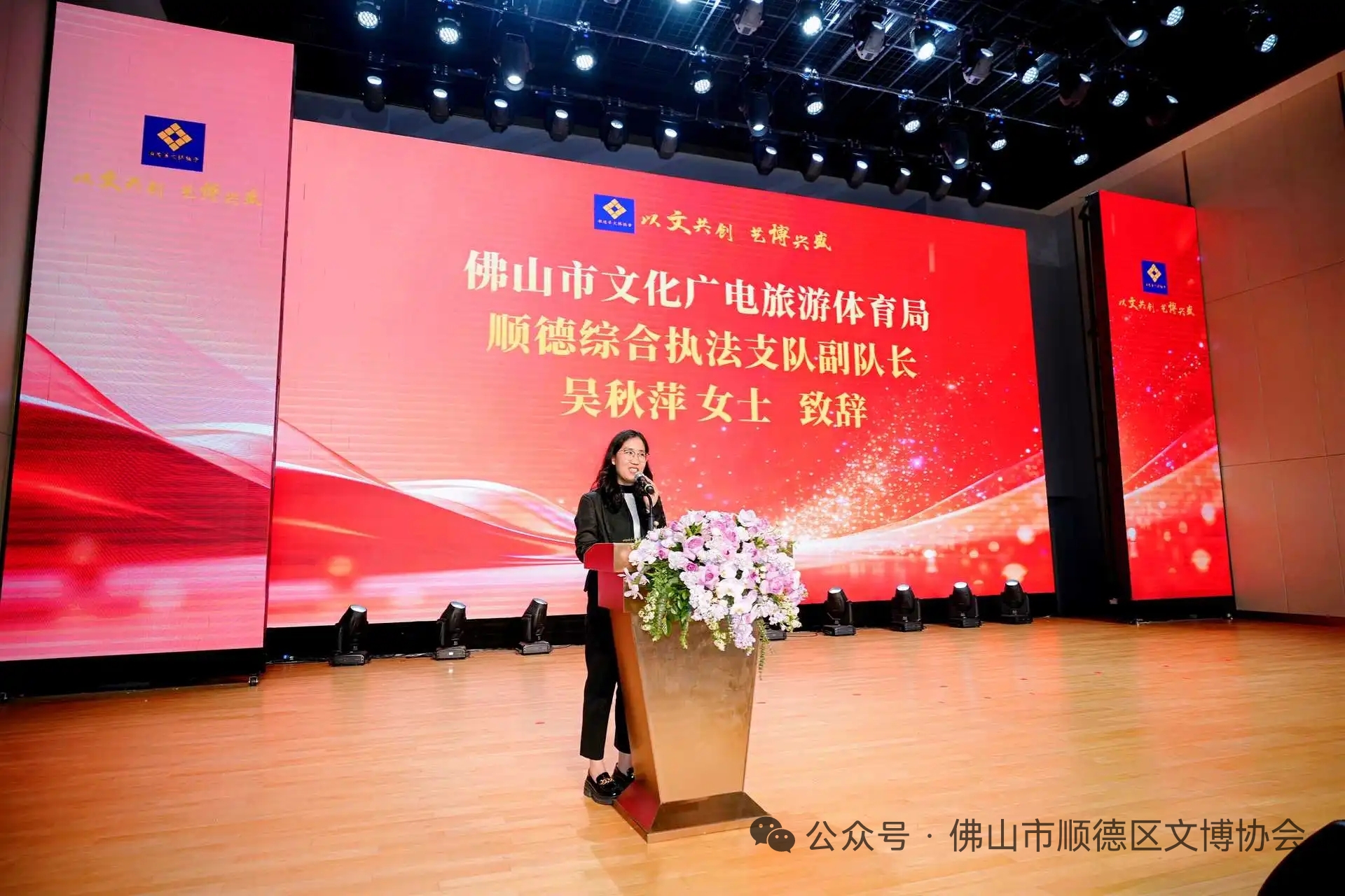 当天下午4时30分,第三届第二次会员大会正式启幕。市文化广电旅游体育局顺德综合执法支队副支队长吴秋萍出席大会并发言,她对省文旅厅、市文广旅体局长期以来的关心支持表示感谢,充分肯定了协会在段钢会长带领下取得的亮眼成绩,各项活动有声有色,为顺德文博事业发展注入了强劲动力。