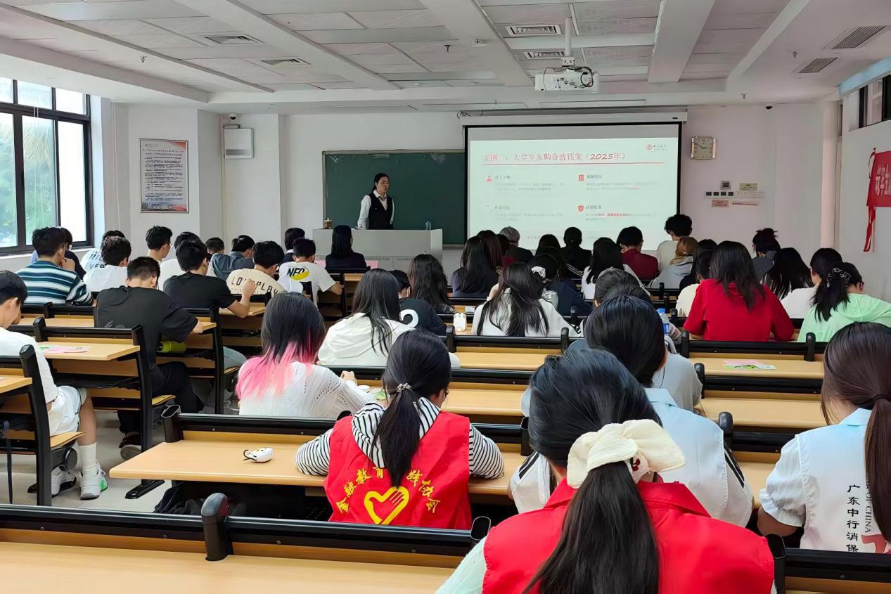 “高薪兼职”“刷单返利”“游戏充值折扣”……这些看似诱人的“校园商机”,背后往往隐藏着电信网络诈骗,甚至洗钱的陷阱。宣讲会上,中国银行佛山分行的金融讲师结合真实的案例和数据,深入浅出地讲解了洗钱的概念、社会危害及防范要点。