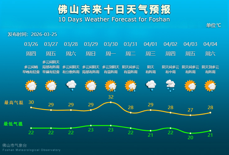 佛山市气象台3月25日预报,26日多云间晴,早晚有轻雾,气温22℃~30°C。27日多云间阴天,局部有阵雨,早晚有轻雾,气温22℃~29°C。28日至29日(周末)多云间阴天,有分散阵雨或局部阵雨,气温22℃~29°C;30日至31日云量较多,有雷阵雨,气温先升后降,分别为23℃~32°C、22℃~28°C。