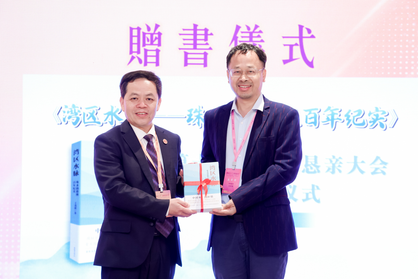 中国作家协会会员、顺德区作家协会主席王茂浪(右)向大会捐赠其著作《湾区水脉——珠水润港澳百年纪实》。