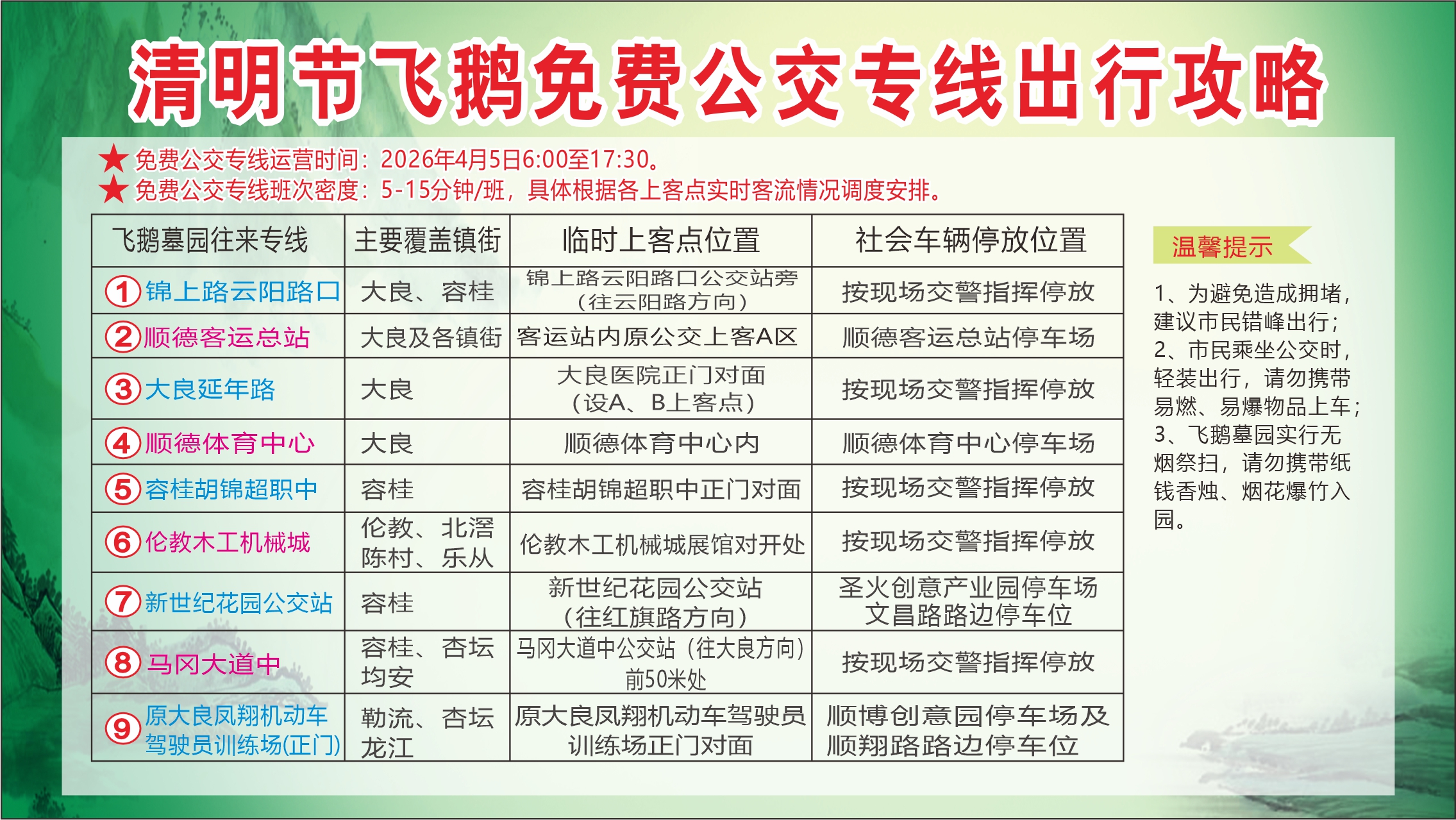 4月6日、11日、12日:仅开通大良飞鹅墓园1条专线。