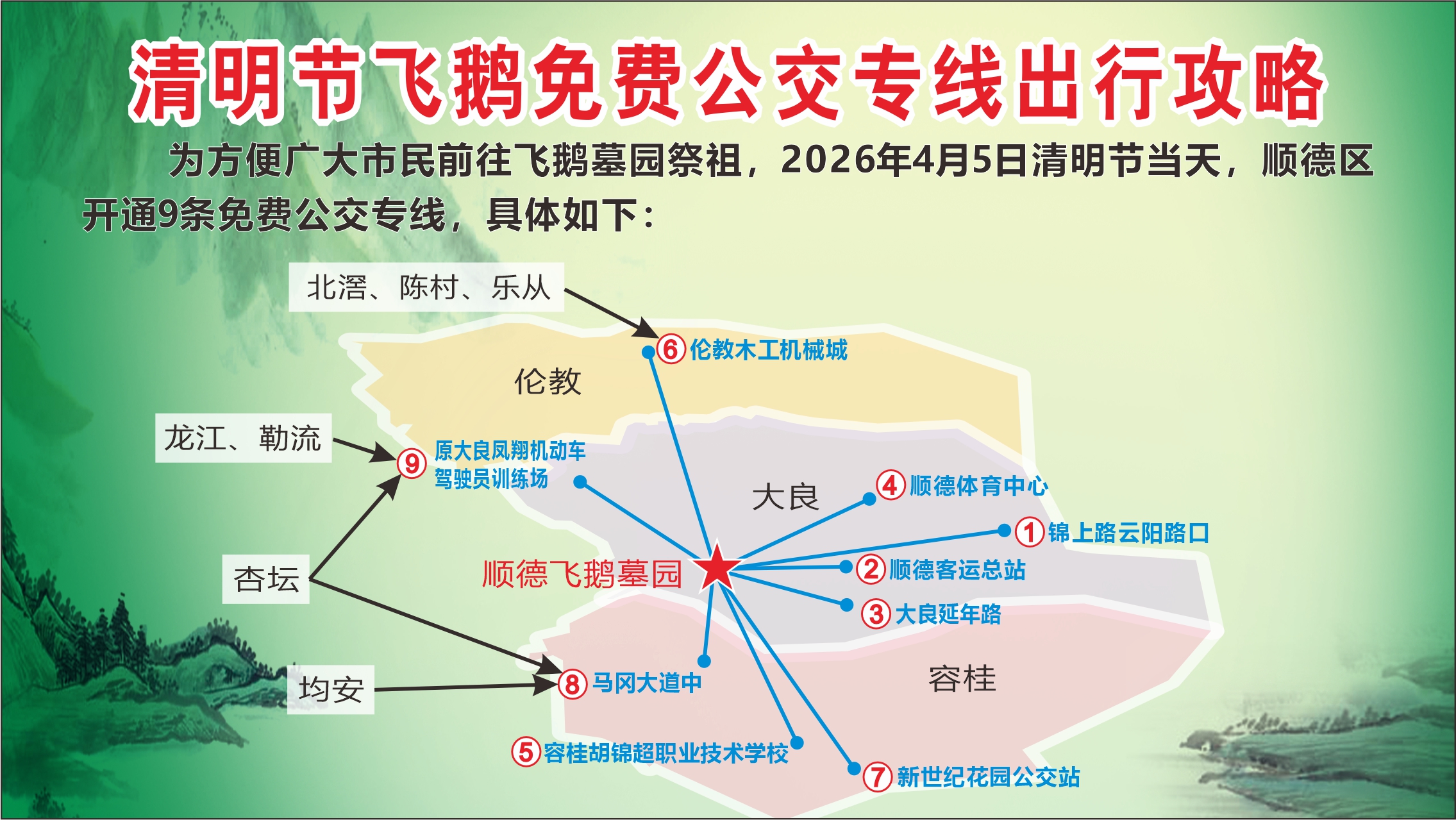 清明祭扫高峰将至,为方便市民平安、便捷出行,顺德2026年清明节免费公交专线正式上线。覆盖大良飞鹅墓园、北滘祥宁园、陈村静安院,绿色出行、不堵车、不花钱,这份直达+换乘指南请收好!