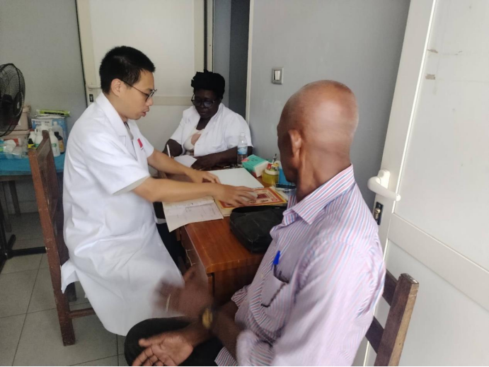 2月26日上午,在巴塔地区医院,一位75岁的老人风尘仆仆地推开了中国医疗队综合诊室的门。他叫里昂西奥,来自200多公里外的蒙戈莫地区,颠簸了五个小时,只为“让中国医生看一看”。