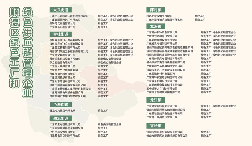 顺德绿色制造基础扎实,目前已培育形成一批绿色制造标杆企业。在北滘镇,广东美的制冷设备有限公司、库卡机器人(广东)有限公司、广东威灵电机制造有限公司等多家企业获评国家级绿色工厂或绿色供应链管理企业。容桂街道的伊之密股份有限公司、广东松下环境系统有限公司,大良街道的广东美芝精密制造有限公司,勒流街道的广东新宝电器股份有限公司、广东联塑科技实业有限公司等企业均榜上有名,形成了覆盖家电、机械装备、机器人、建材、纺织等多个产业的绿色制造集群。
