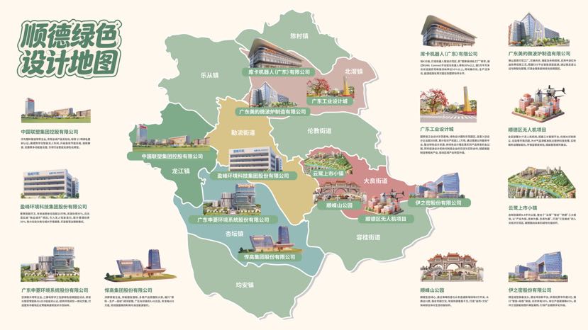 活动现场发布的《顺德绿色设计地图》直观呈现了顺德的绿色版图。地图囊括了云鹭上市小镇、顺峰山公园、库卡机器人、广东工业设计城等绿色设计地标项目,以及遍布全区各镇街的国家级绿色工厂和绿色供应链管理企业。