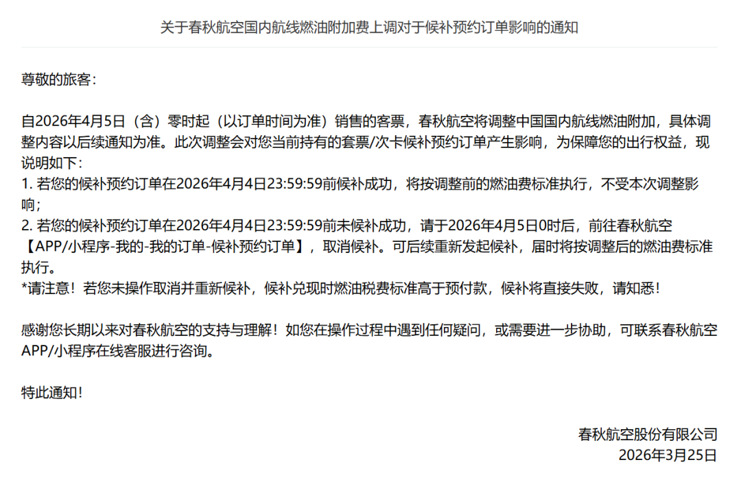 3月25日,春秋航空发布通知,自2026年4月5日(含)零时起(以订单时间为准)销售的客票,将上调国内航线燃油附加费,具体调整内容以后续通知为准。
