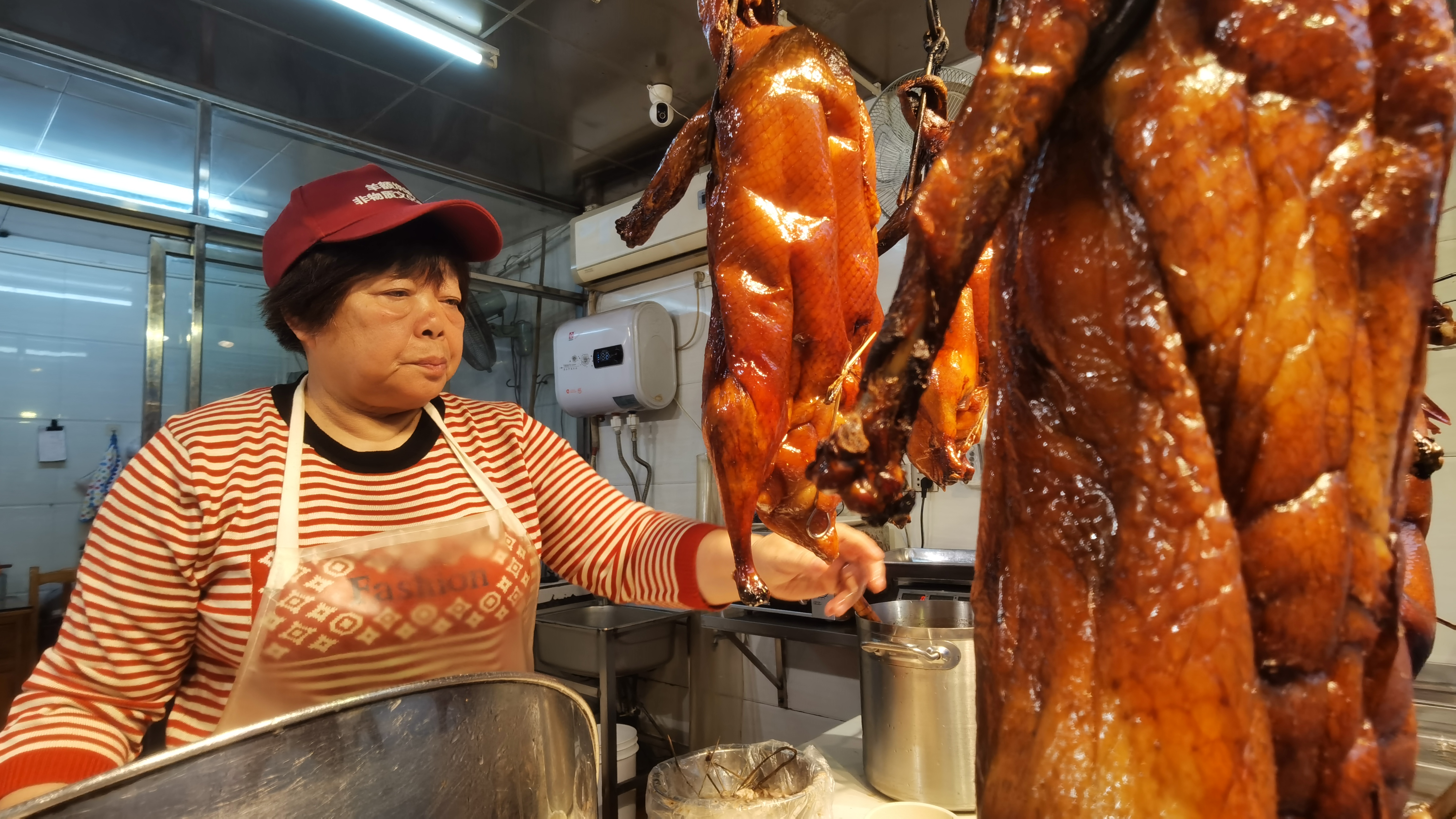 虽然店里请了工人,但在这个生意忙碌的节点,老板何淑芳还是经常会出现在店里,她的身影始终是这样从容、笃定。从16岁拿起斩鹅刀至今,50年的时光里,她手中的刀换了一把又一把,不变的是对每一只烧鹅的用心,和刻在骨子里的诚信。