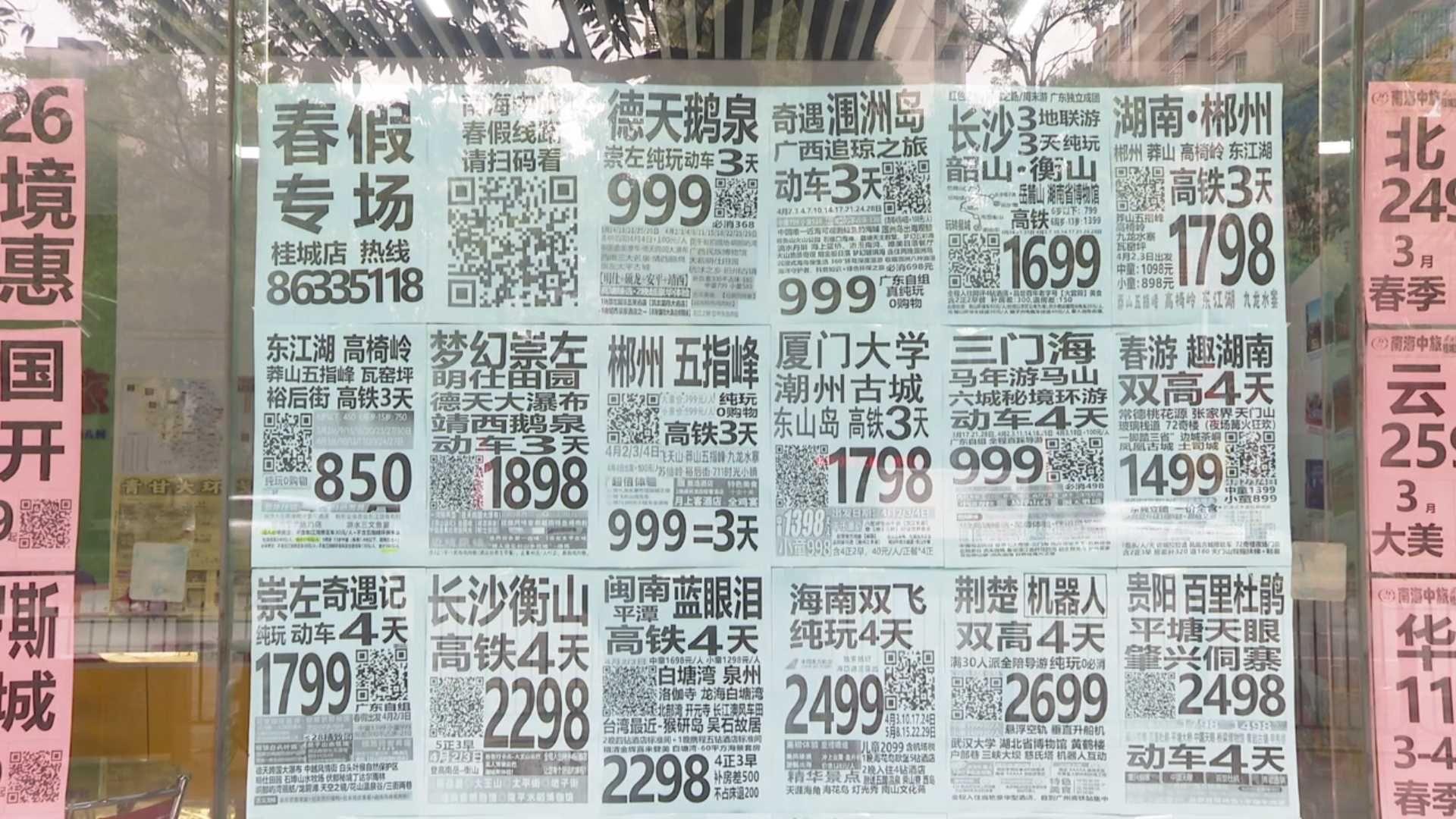 在南海中旅营业部,橱窗醒目位置设置了专区,集中展示春假专场的旅游线路。“湛江寻豚捞蚝高铁3天999元”“平潭蓝眼泪奇遇高铁4天2298元”“宁泰扬锡春色双飞4天3298元”.....各式线路琳琅满目,团费诱人。