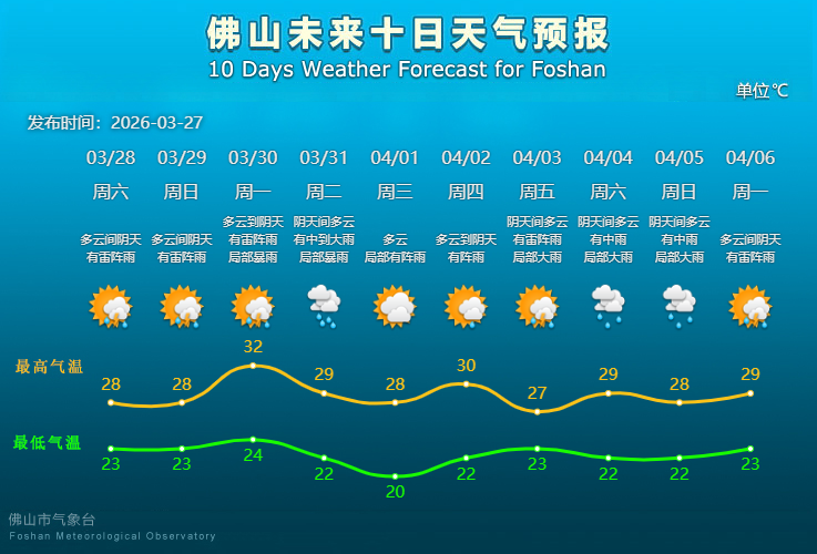 佛山市气象台3月27日预报,28日至29日佛山有雷阵雨,气温23℃~28°C。30日至31日雨势明显增强,其中30日有雷阵雨、局部暴雨,31日有中到大雨、局部暴雨,雷雨时伴有短时强降水、8~10级短时大风和局地冰雹等强对流天气,气温先升后降,分别为24℃~32°C、22℃~29°C。