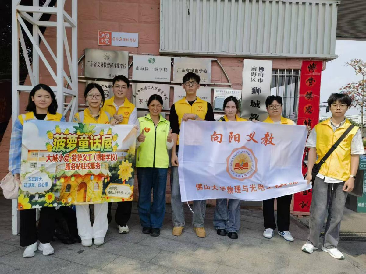 同时,学院向阳义教团队还联合颜峰社区,走进狮山博雅学校,依托“大城小爱·菠萝义工服务站”驻校服务,开展“菠萝童话屋”主题活动,为孩子们带来游戏陪伴与暖心交流。