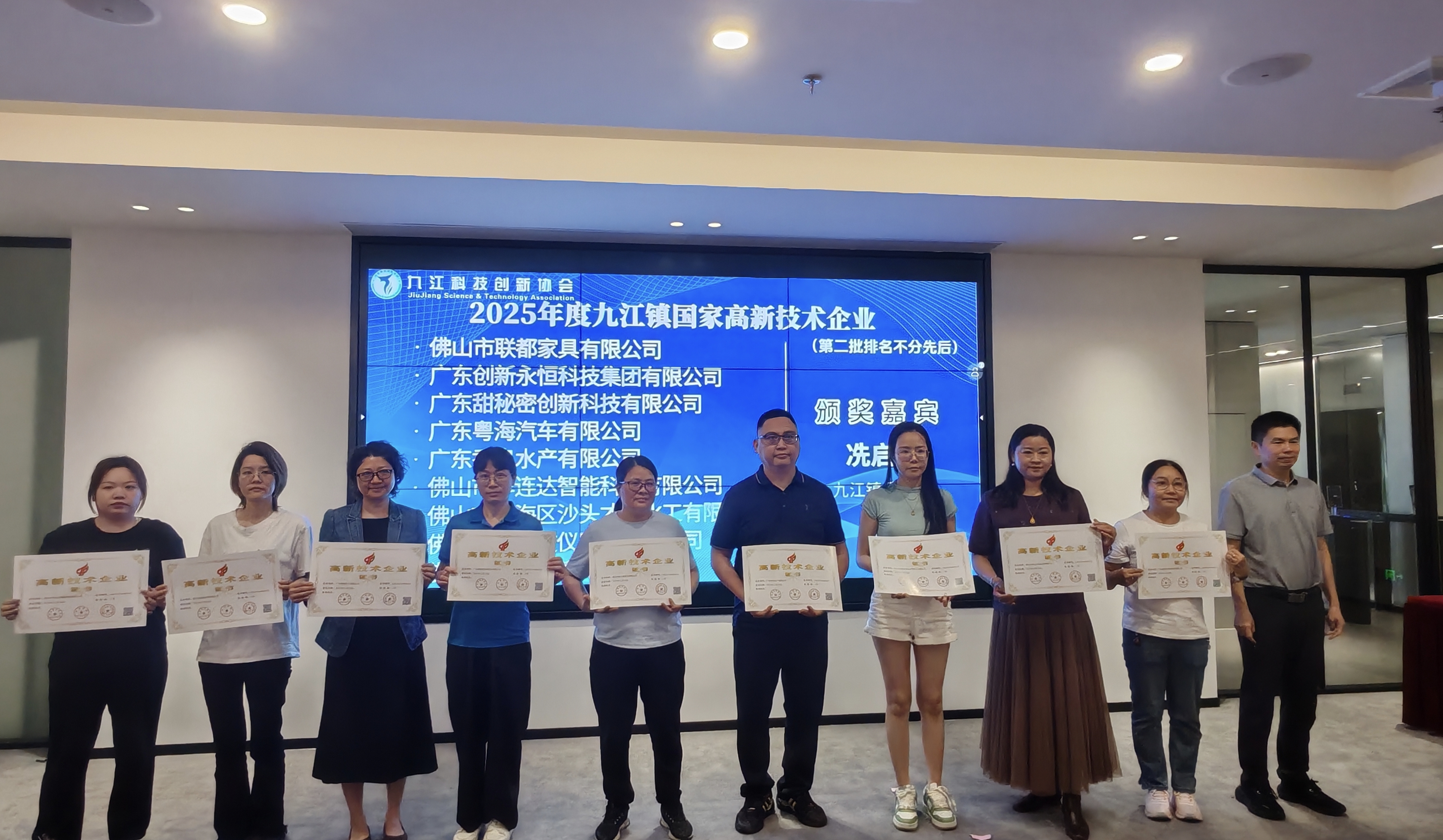 九江镇为2025年度国家高新技术企业颁发证书
