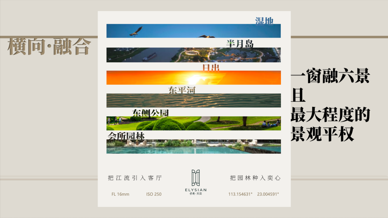 楼栋采取一字排布,实现户户东南向望江,通过最大化玻璃幕墙与景观阳台设计,形成270°环幕视野,将江景、园景与城市界面引入室内。由近及远,视野依次覆盖会所园林、东侧公园、东平河、日出景观、半月岛及湿地生态,形成“一窗融六景”的景观格局。