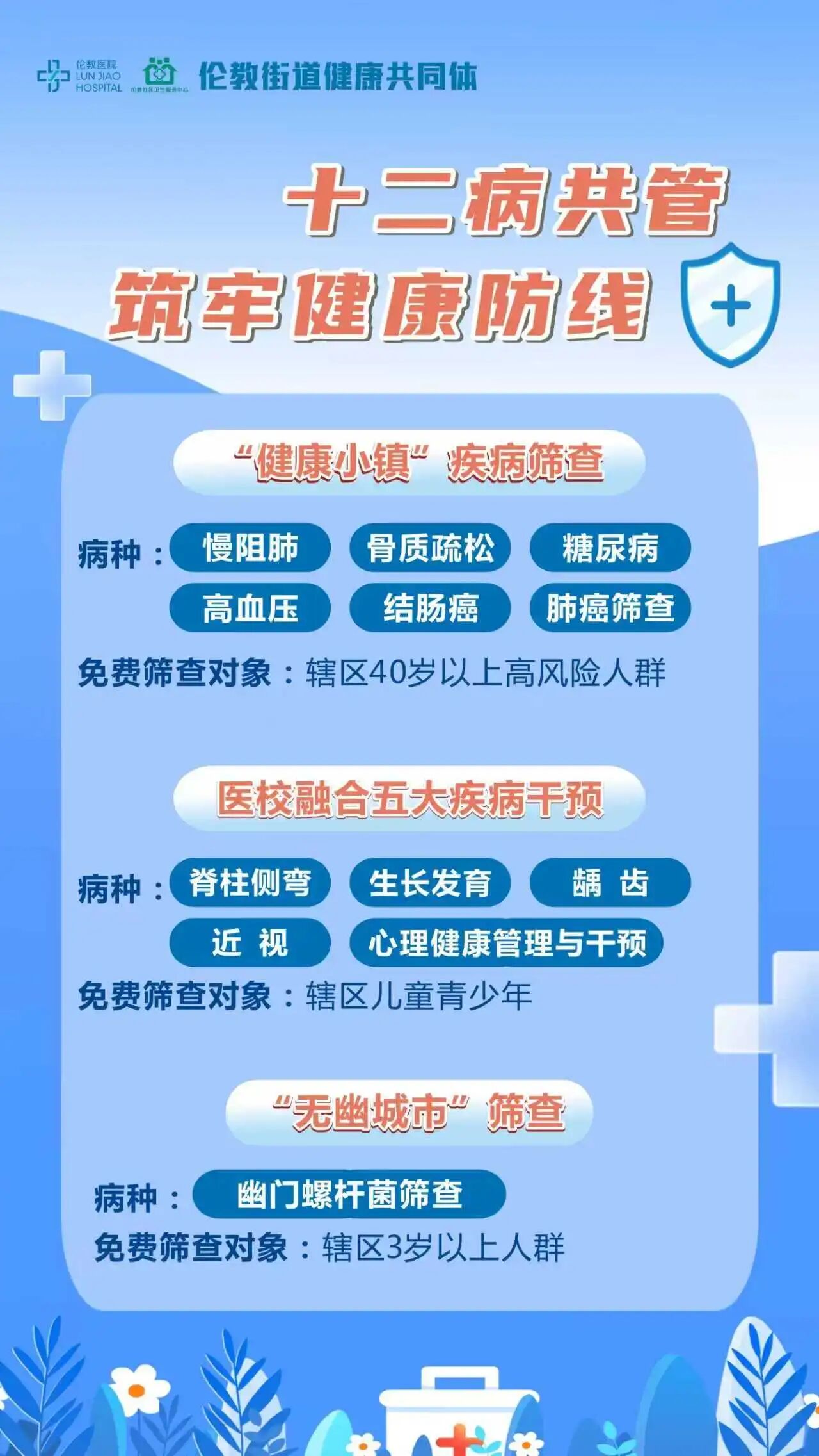 ·组建多学科家庭医生团队,构建全流程闭环管理,为辖区居民提供全生命周期健康守护,提供基本公卫服务、学生“五病筛查”、疫苗接种等服务;提供幽门螺杆菌、乙肝、肝吸虫、盆底功能、慢阻肺、高血压、糖尿病、结直肠癌(40岁以上)、骨质疏松、肺癌等高危人群筛查;