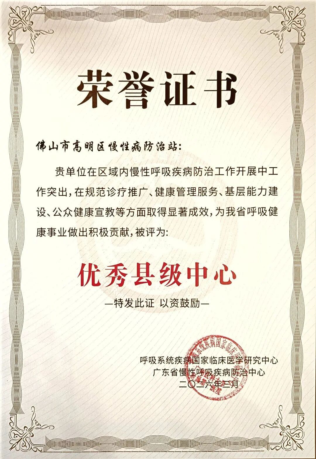 近日,高明区慢性呼吸疾病防治中心(挂靠区慢病站)在慢性呼吸疾病防治工作开展中成效突出,获评“广东省优秀县级中心”。