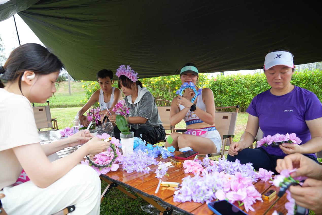 冲过终点线后,情缘花海大草坪上等待跑友们的是两重“治愈系”大礼包。在簪花DIY区,专业老师指导跑友用仿真花与新鲜花材制作独一无二的春日头饰,戴在头上置身花海,随手一拍就是大片。