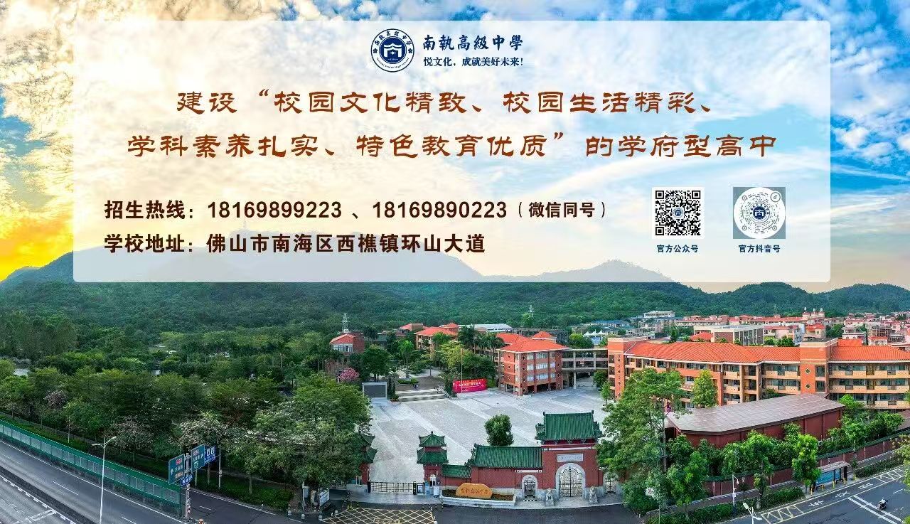 据了解,南执高级中学(原南海执信中学)创办于1999年,坐落于理学名山西樵山东麓、珠江干流北江之畔,岭南园林式校园,古雅清幽,自然灵动。传承执信百年名校文脉,以纳亚尔贝斯“教育的本质是唤醒”为思想根基,立足青少年身心发展规律,凝练出独具南执特色的“悦文化”育人体系。南执高中坐拥200余亩广阔空间,在校师生2700余人,现代化教学与生活服务设施设备完善。历经近三十载办学积淀,已成为享誉广佛的老牌、优质、特色民办高中。