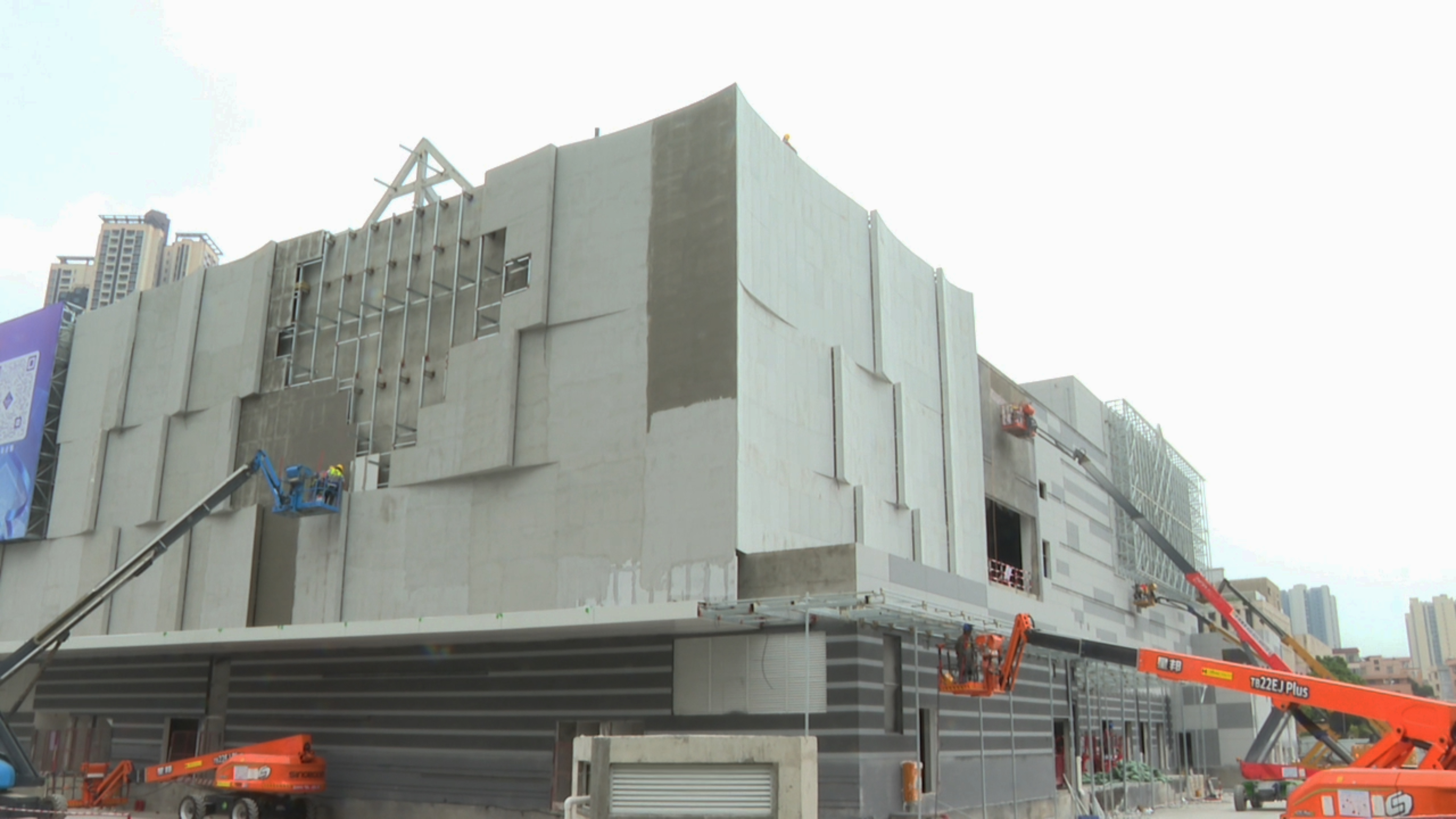 脚手架拆除,灰白外立面初露真容;登高车缓缓升降,工人们忙着为幕墙做最后找平……3月27日,记者再次走进佛山禅城山姆会员商店项目现场,眼前景象与数月前封顶时已截然不同。从“框架搭建”到“精雕细琢”,这个总投资约6.04亿元、总建筑面积6.7万平方米的高端商业综合体,已进入竣工交付前的冲刺阶段。