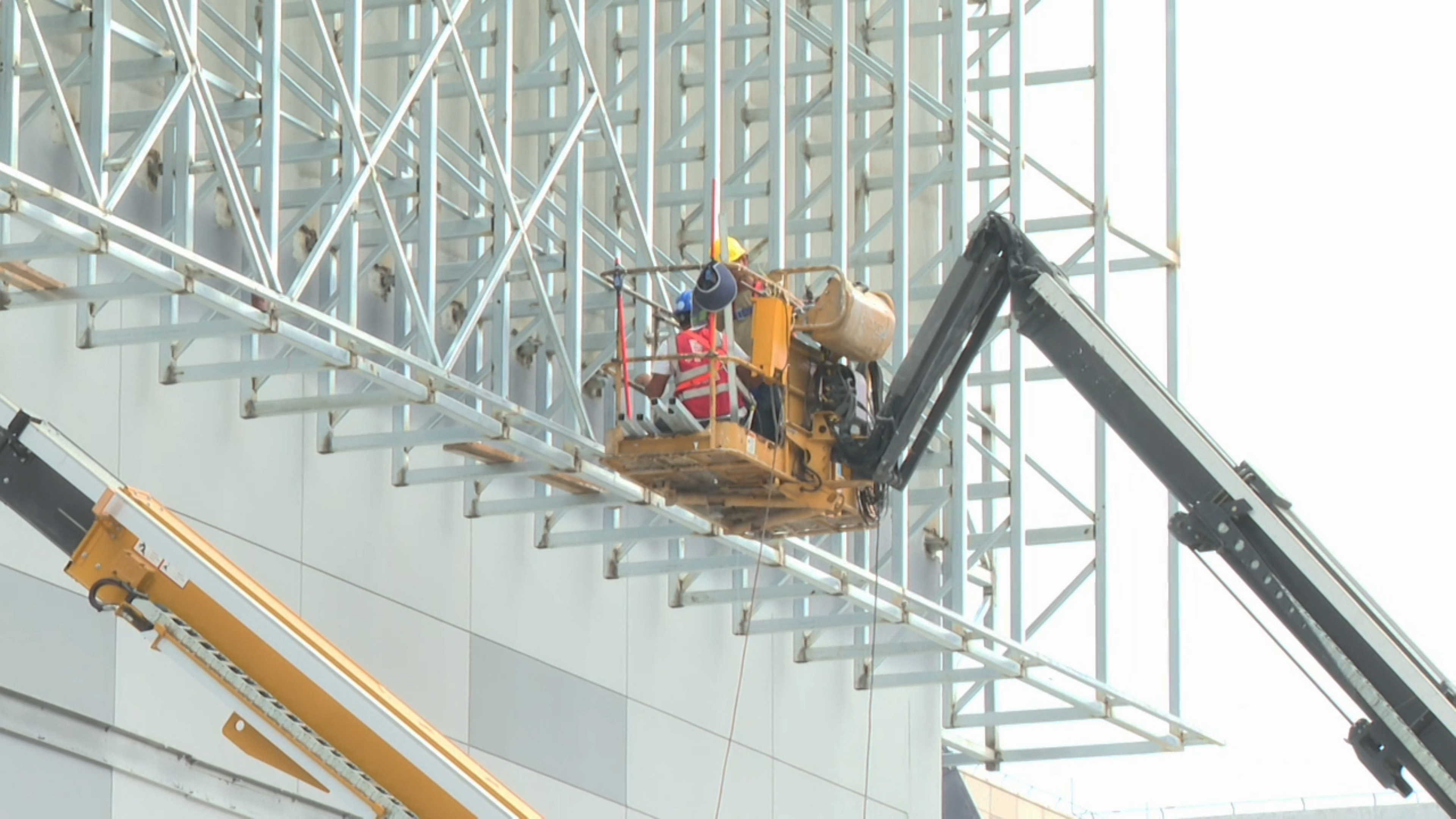 南侧塔吊已拆除,工人正修补留下的洞口,同步安装雨棚骨架。室内机电调试也在同步推进,暖通、消防等多专业工种交叉作业,通风管道、墙板等设施逐一落位,焊花闪烁间,项目从内到外逐渐丰盈。