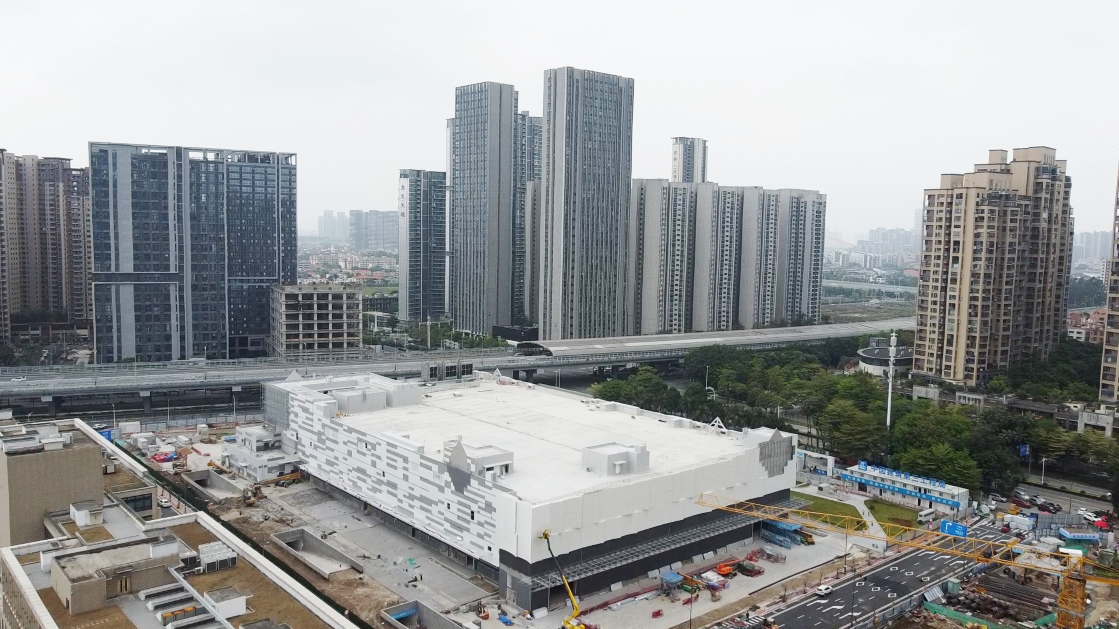 记者在现场看到,项目周边配套也在同步完善。西侧道路计划下月中旬拆除围挡并铺设园林,南侧锦明路正进行回填施工,未来将整体绿化;东侧紧邻一所外籍人员子女国际学校,项目建成后将与之形成高品质生活圈。项目主体为地上两层卖场、地下两层停车场,目前内部正进行机电通道及墙板安装,地面后续将进行铺设处理。