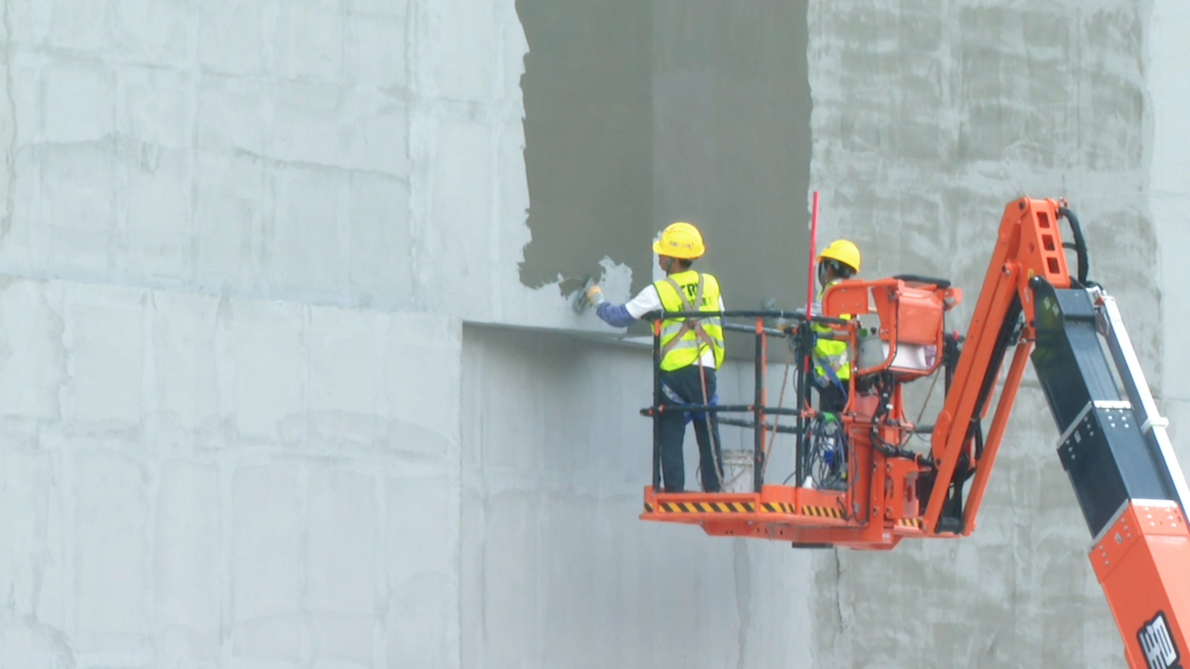 走进工地,现场约220名工人正忙碌在各作业面上。外立面幕墙班组工人进行真石漆喷涂前的最后找平,登高曲臂车缓缓升起,将工人送至高处完成抹灰作业。