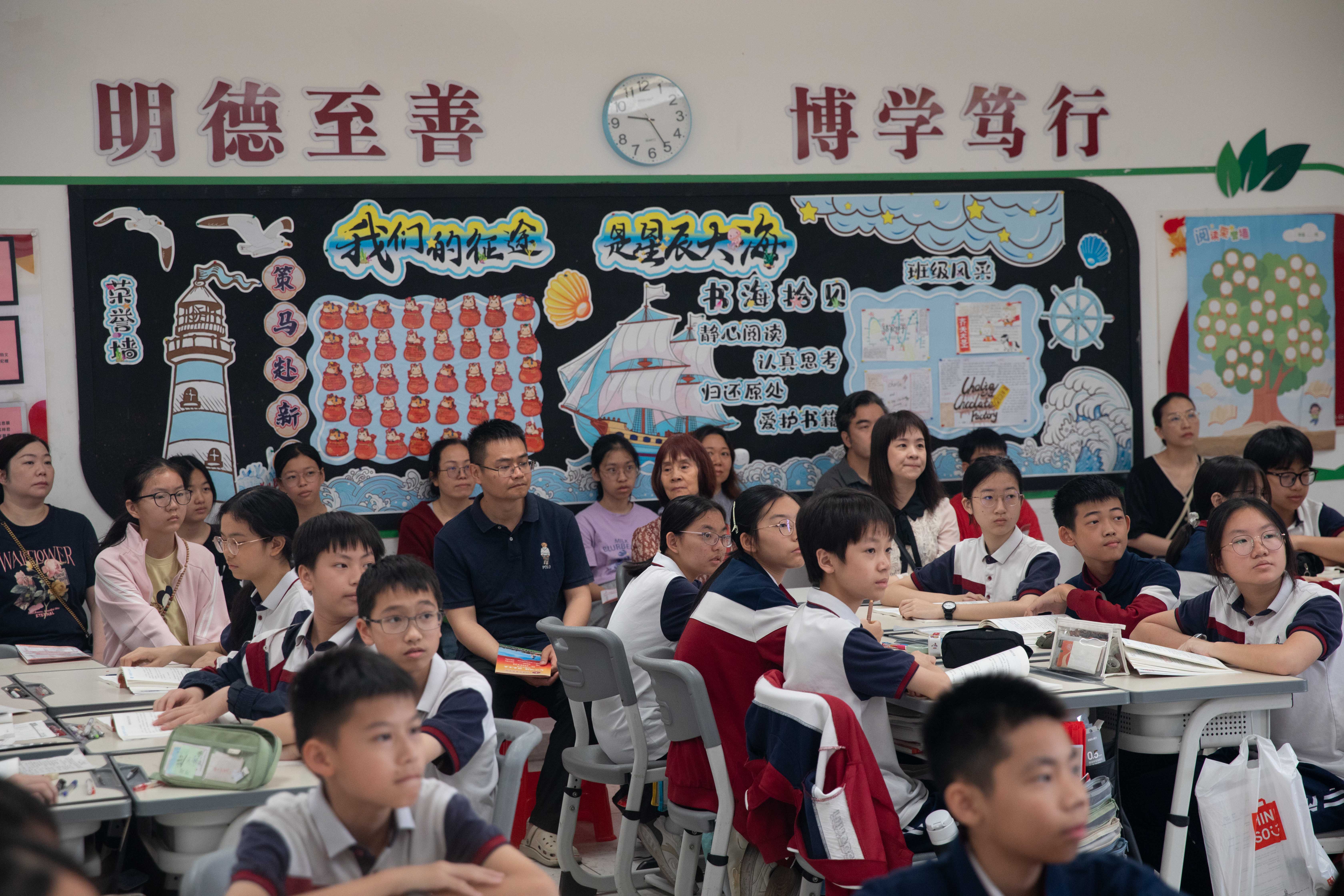 如709班誉小霞老师的道法课上,尾声的AI互动环节,拓展学生的知识边界,让原本枯燥的课堂变得鲜活;809班王秀平老师的英语课,以趣味游戏点燃氛围,现场欢声笑语不断;710班廖莉莉老师的课堂创新采用语文+美术双师教学,文字之美与艺术创作相融相生,让学习多了几分诗意。
