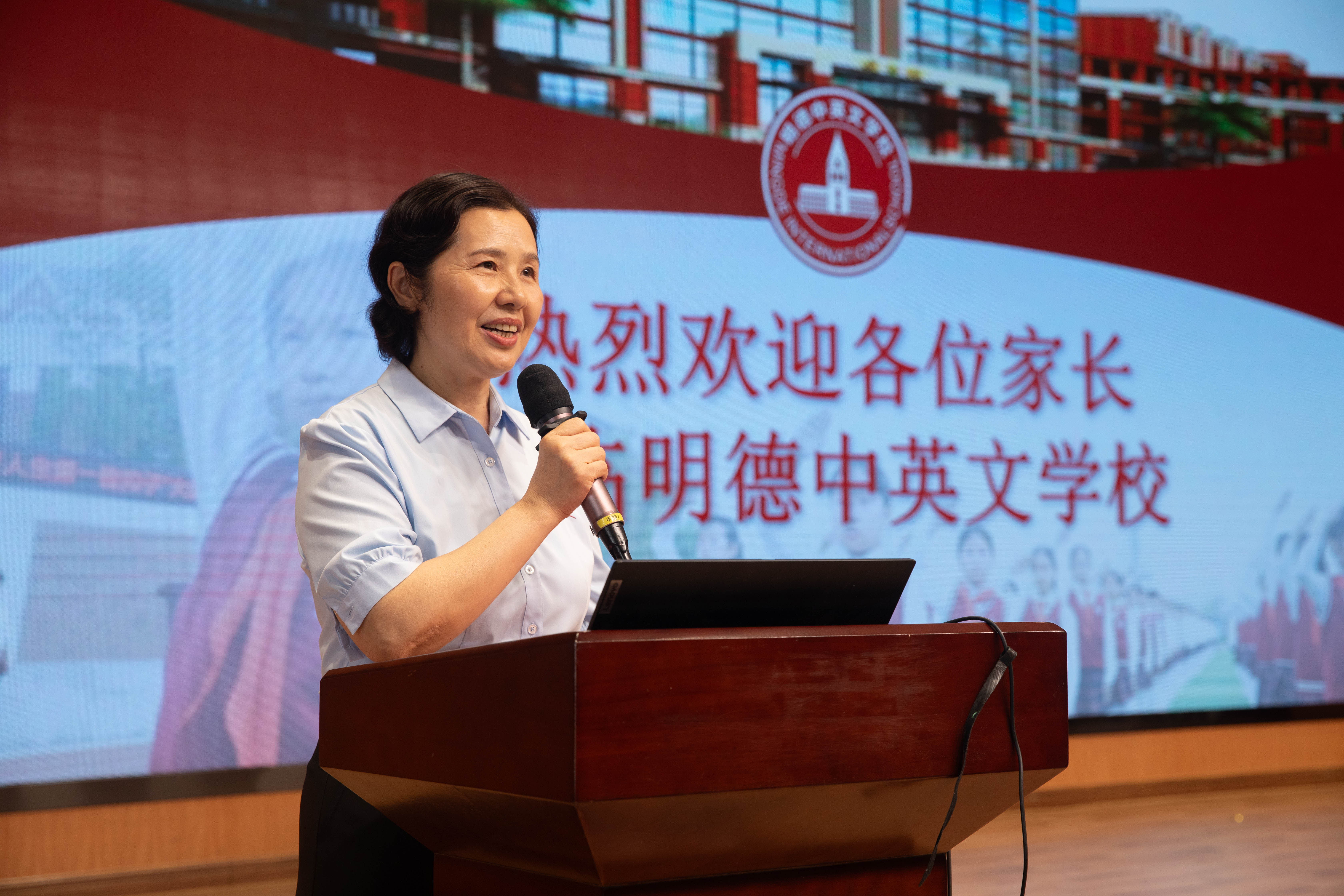 在“明德大讲堂”上,校长周秀丽的分享让家长们对学校有了更深入的了解。据悉,明德中英文学校是禅城区第一所中英文学校,自2021年8月创办以来,始终秉持“以德求得,以仁育人”的办学理念,致力于培养兼具科学思维、人文情怀、民族担当与国际视野的现代公民。