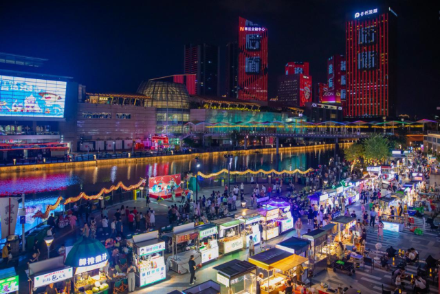 欧式风情的滨水街区,夜晚楼宇灯光秀与水幕表演交相辉映。夜市摊位沿湖而设,可以一边品尝炭烤生蚝、爆浆鸡蛋仔、印度飞饼,一边欣赏璀璨夜景。