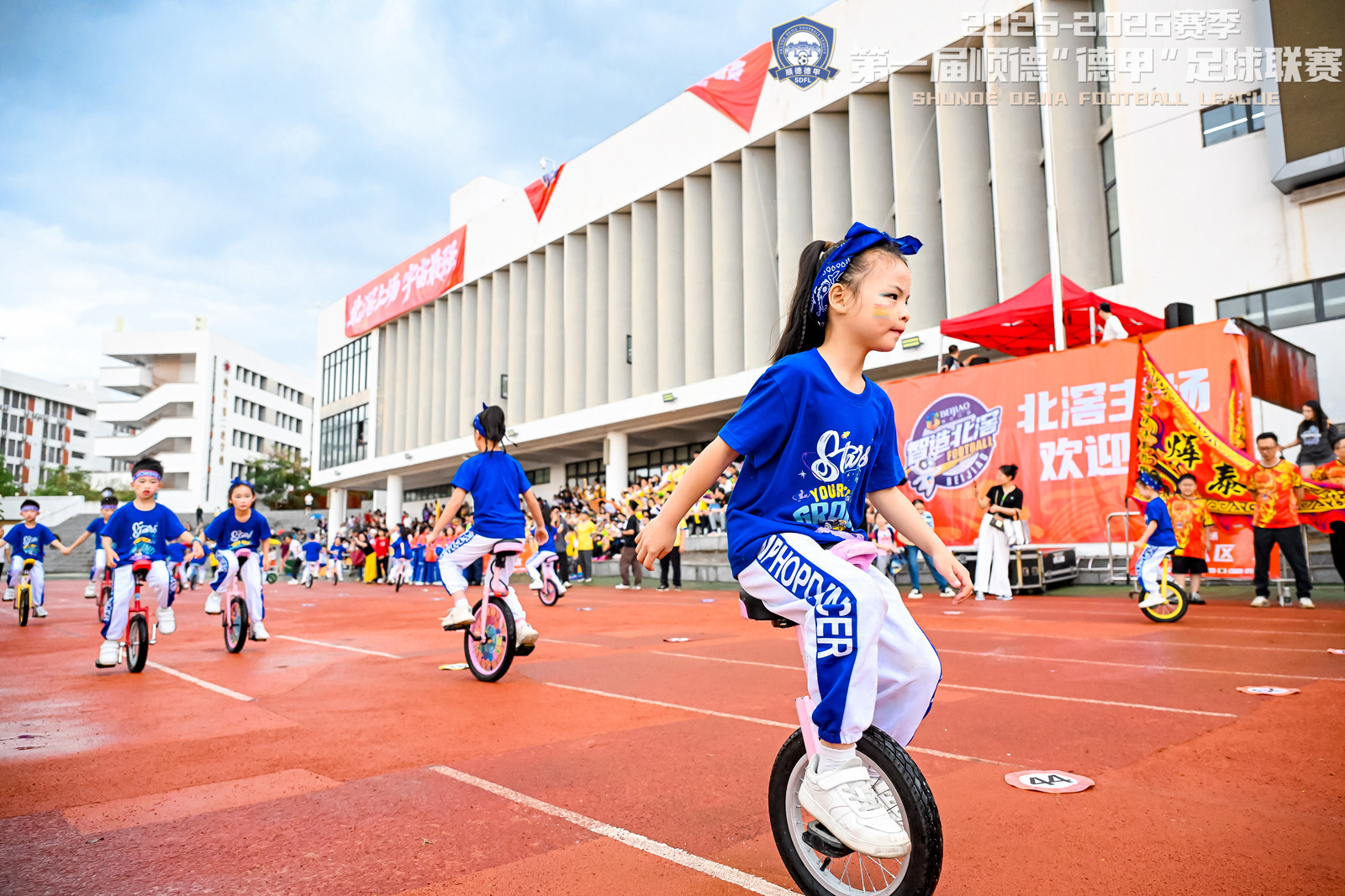比赛尚未开球,现场气氛已被推向高潮。作为本轮赛事的主办方,北滘主场精心策划了一系列亮点环节。美辰学校独轮车队率先登场,这支以“低龄普及、全员参与、技能进阶”为特色的队伍,用整齐灵动的编队行进与花式技巧表演,赢得了阵阵掌声。孩子们在骑行中展现出的平衡、协调与专注力,为这场草根足球对决注入了蓬勃朝气。
