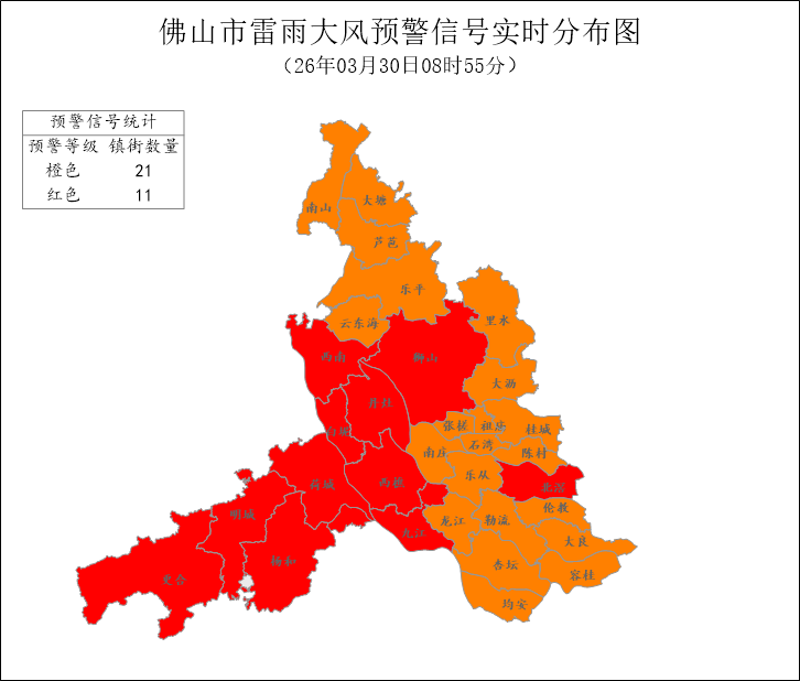 03月30日07时35分-03月30日08时35分,我市出现强雷雨,并伴有10-12级大风,各区最大阵风(米/秒):高明荷城35.7(12级)、南海狮山31.2(11级)、禅城石湾27.5(10级)、三水大塘26.4(10级)、顺德乐从23.3(9级)。目前高明、三水西南、白坭、南海九江、西樵、丹灶、狮山雷雨大风红色预警信号,其余镇街雷雨大风橙色预警信号,禅城、南海、顺德、三水、高明冰雹橙色预警信号正在生效,请注意防御。佛山市气象台2026年03月30日08时40分发布