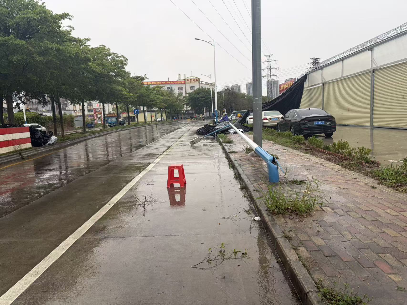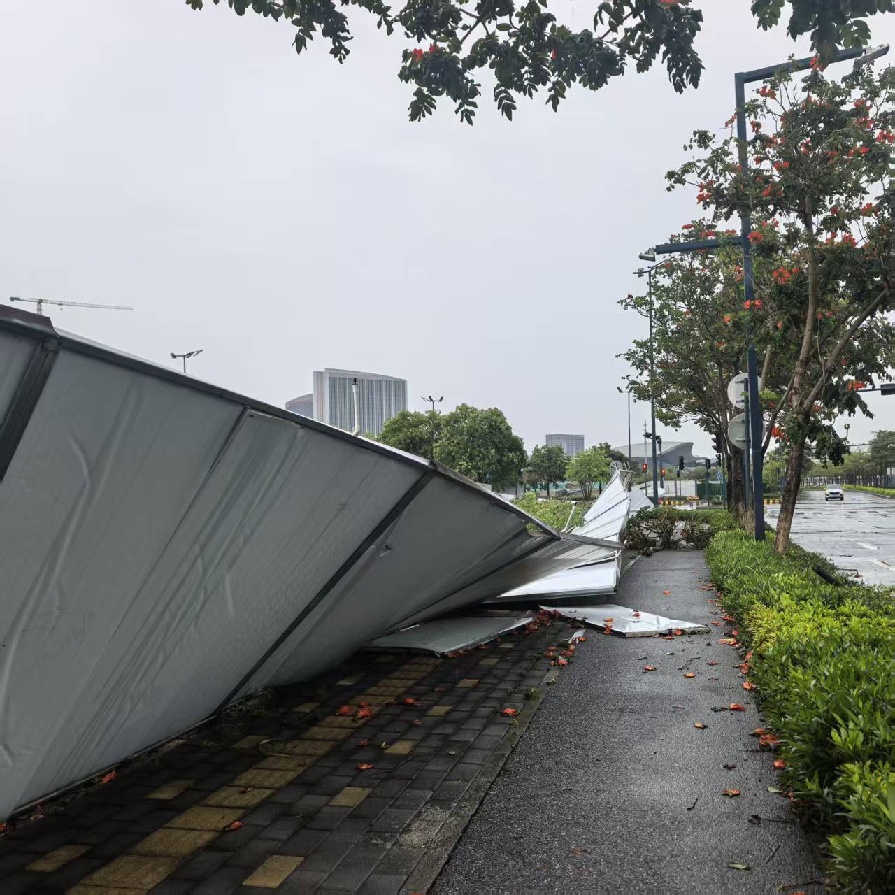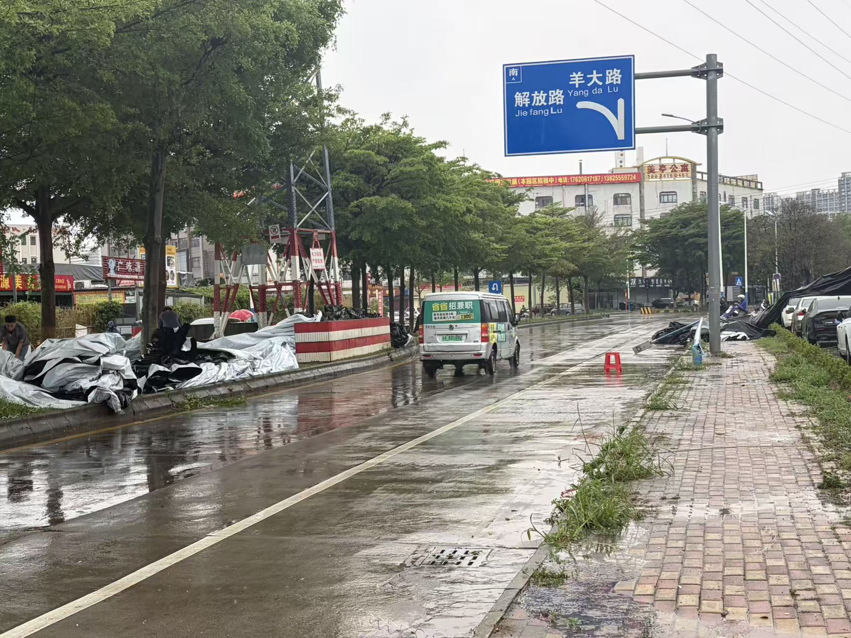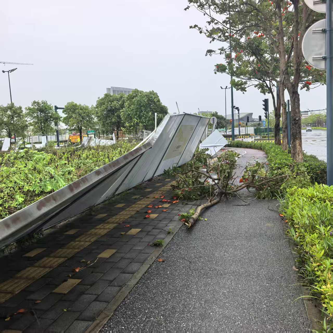 顺德区荷岳南路有大批围栏倒伏。(佛山市新闻传媒中心记者莫璇)