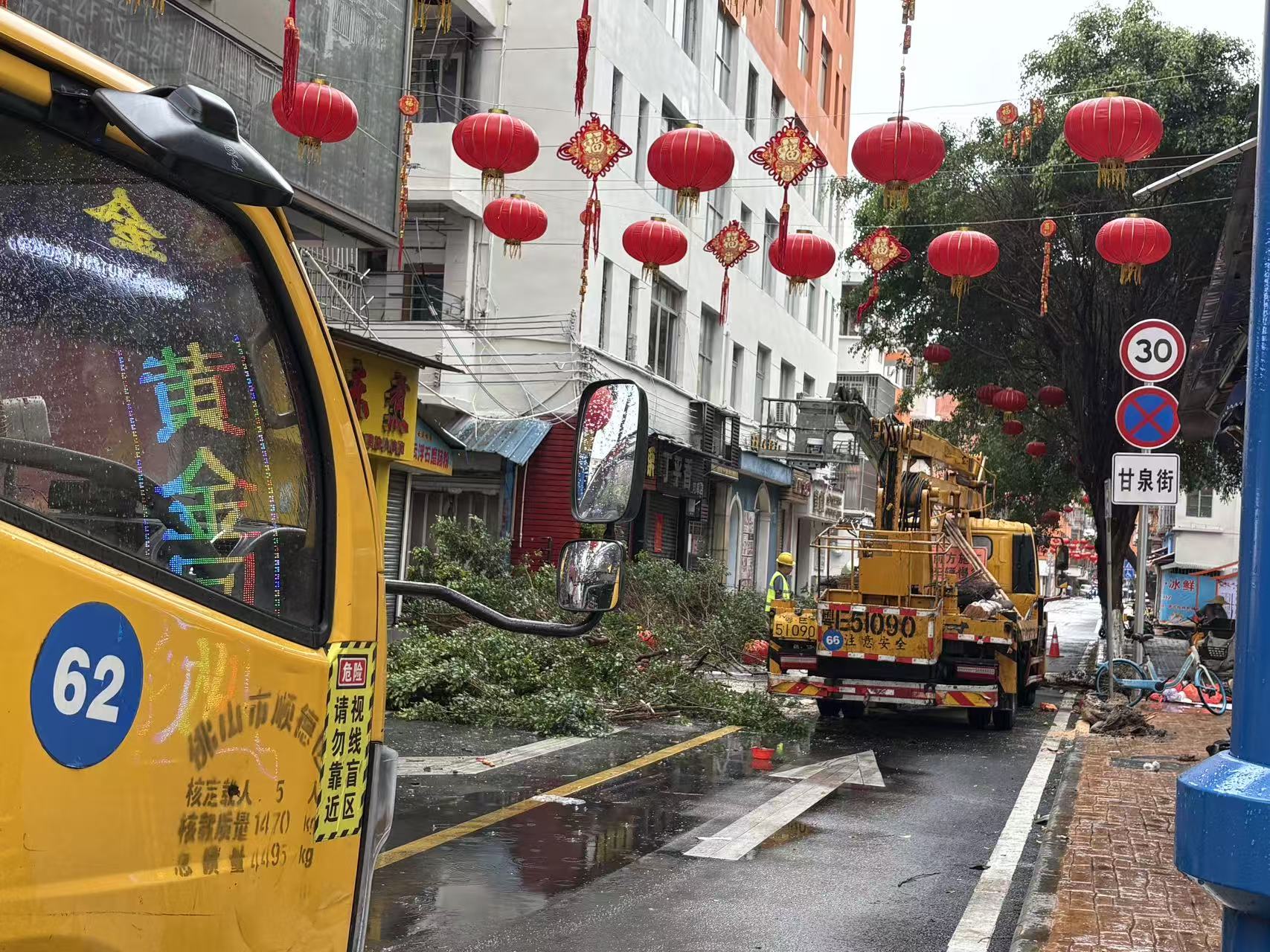 伦教熹涌裕成中路有路灯倒下,供电部门工作人员到现场作临时处理,道路已恢复通车。