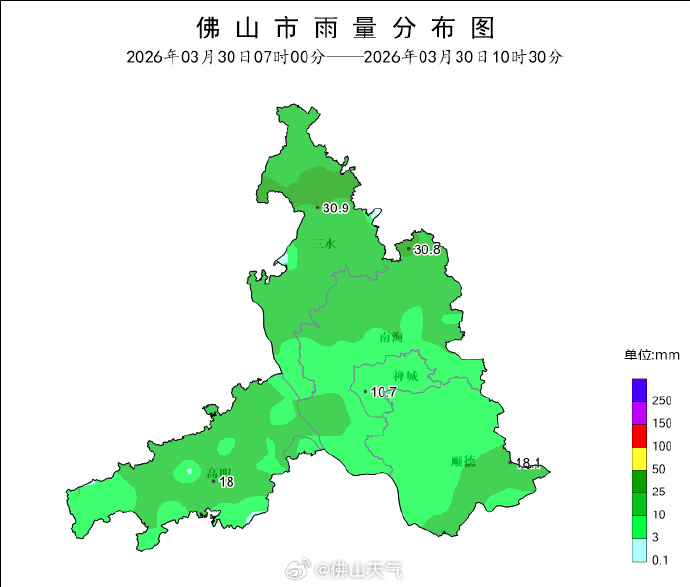 三水区、高明区、禅城区短时积水黄色预警信号发布:受强降雨影响,预计以上区域部分路段可能出现0.25米以上的短时积水,请各有关单位密切注意城乡积涝。佛山市水务局、佛山水文分局联合发布(2026年3月30日8时40分)