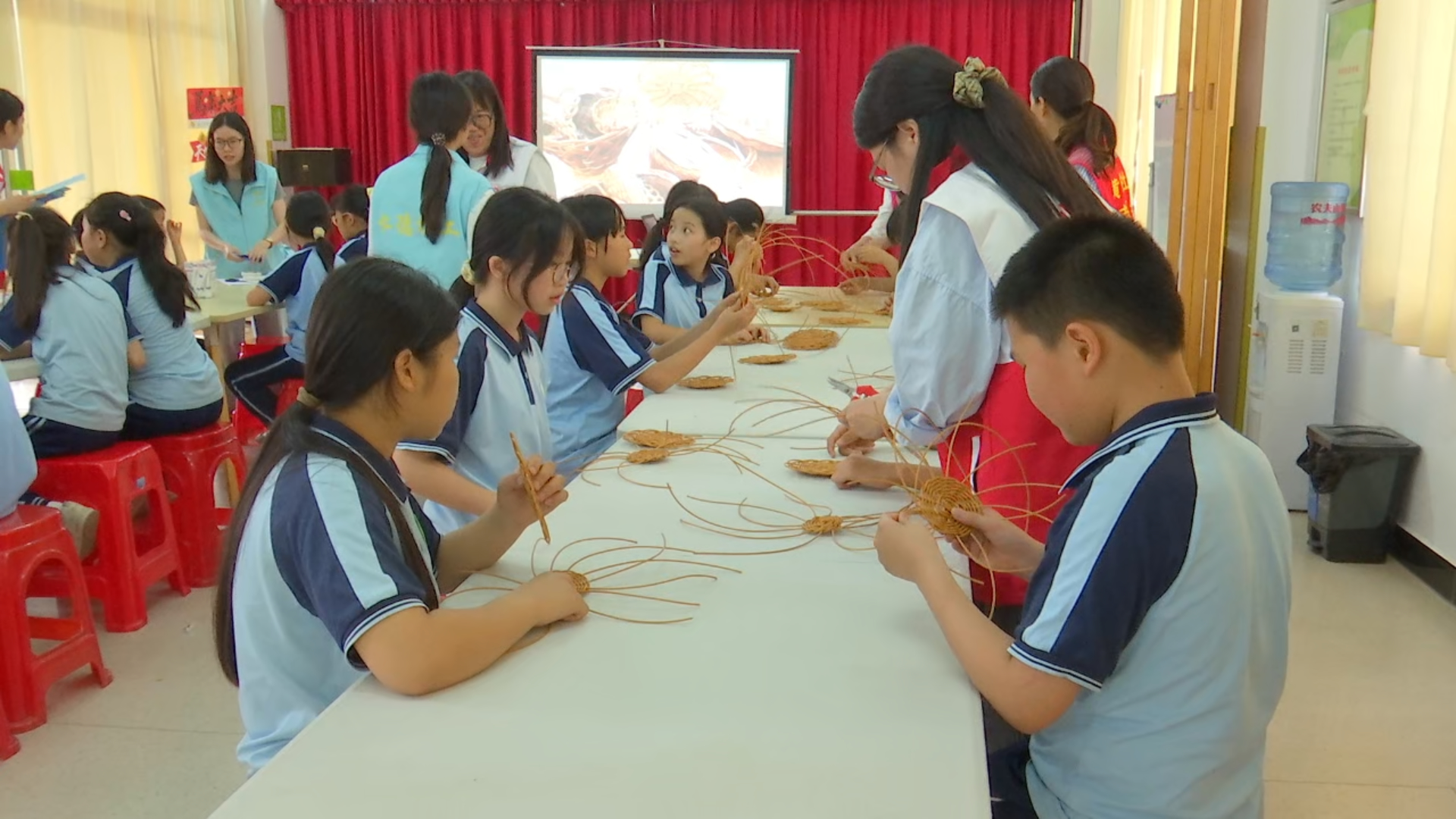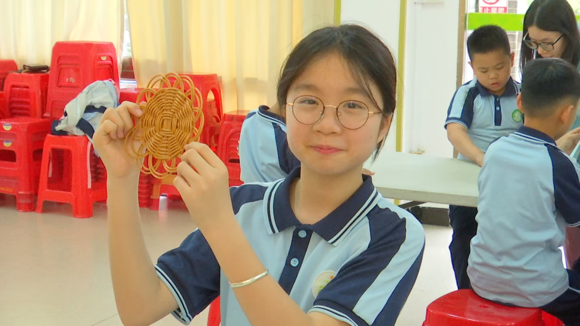 在漖表小学,这种“校内+校外”的联动模式尤为亮眼。学校将托管服务延伸至社区,组织学生走进附近的黄岐漖表龙舟基地,亲身体验市级非遗“藤编技艺”。在传承人的手把手指导下,五年级学生张雅琳和同学们从生疏到熟练,最终完成了自己的藤编杯垫。“虽然不完美,但特别有成就感,让我知道了传统手艺的不容易和宝贵。”张雅琳举着自己的作品说。