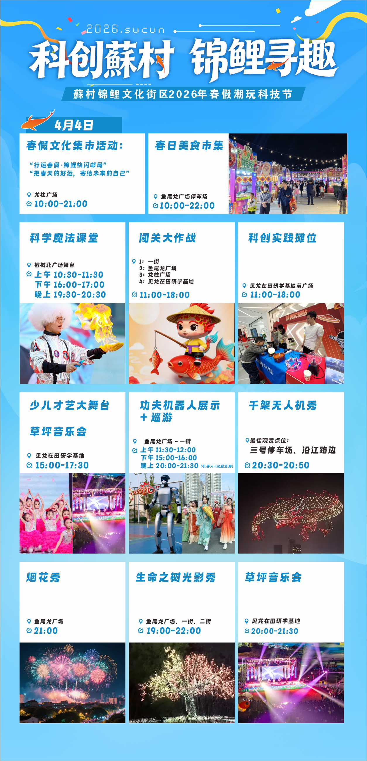 连续5天的蘇村春假潮玩科技节,囊括了千架无人机夜空秀、烟花秀、科学魔法课堂、功夫机器人巡演、生命之树光影秀、闯关集章、美食市集、汉服巡游以及草坪音乐节等视听盛宴,极大丰富了市民的春假体验。