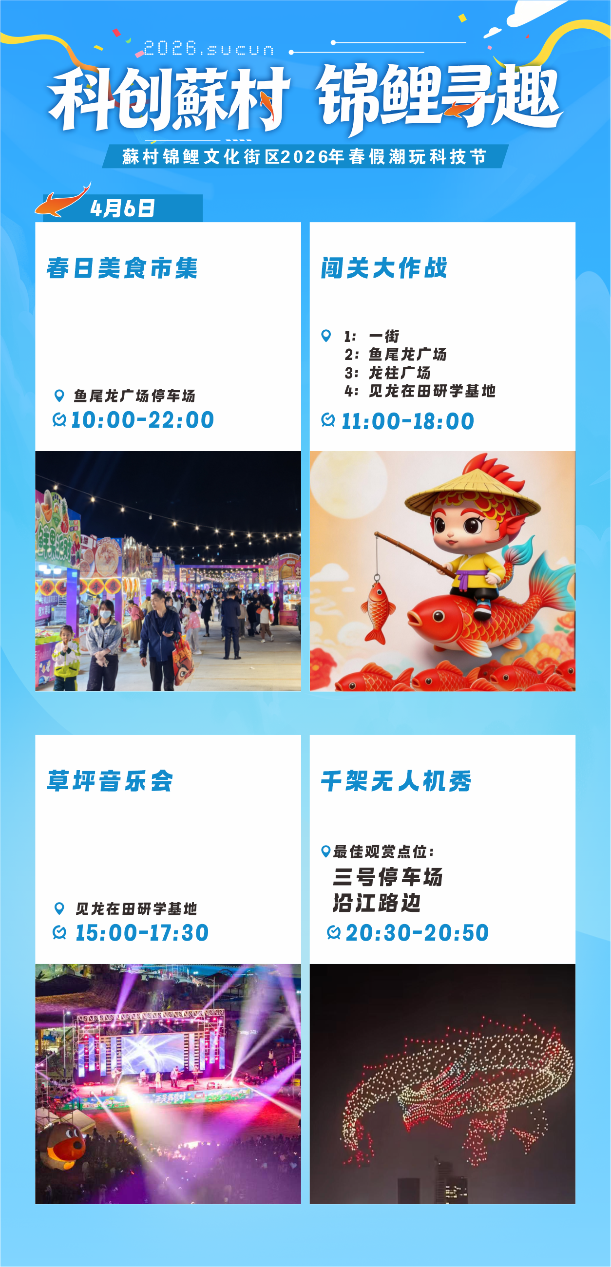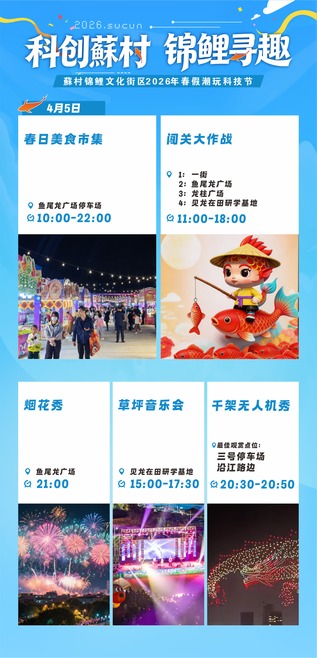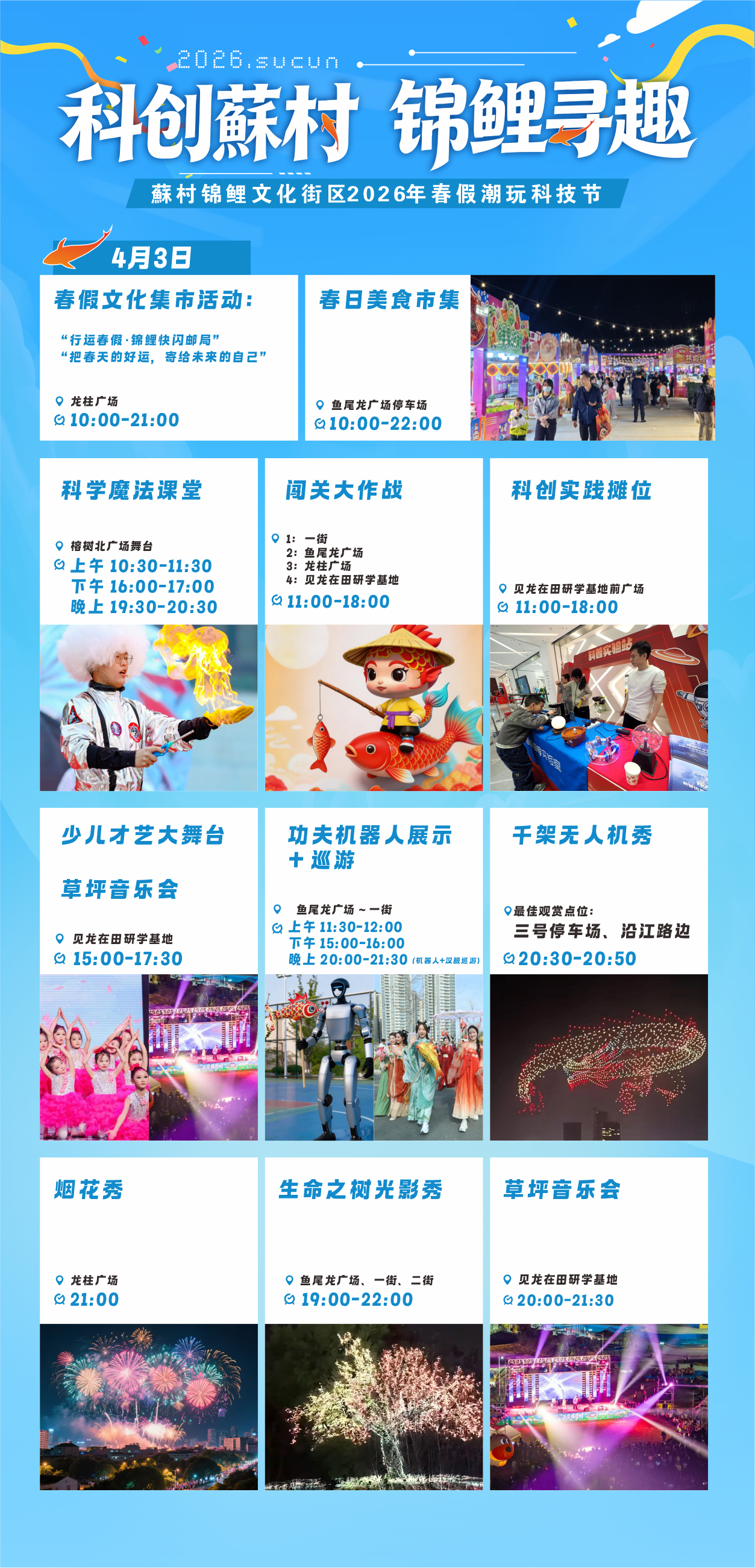 连续5天,千架无人机夜空秀、科学魔法课堂、功夫机器人巡演和璀璨烟花秀等节目连番上演,高明蘇村锦鲤街区成为“春假必去乡村文旅目的地”。恰逢佛山春假和清明假期,4月2日-6,蘇村锦鲤文化街区2026年春假潮玩科技节(下称“蘇村春假潮玩科技节”)将一连五天举行,吸引众多亲子家庭前来畅玩。
