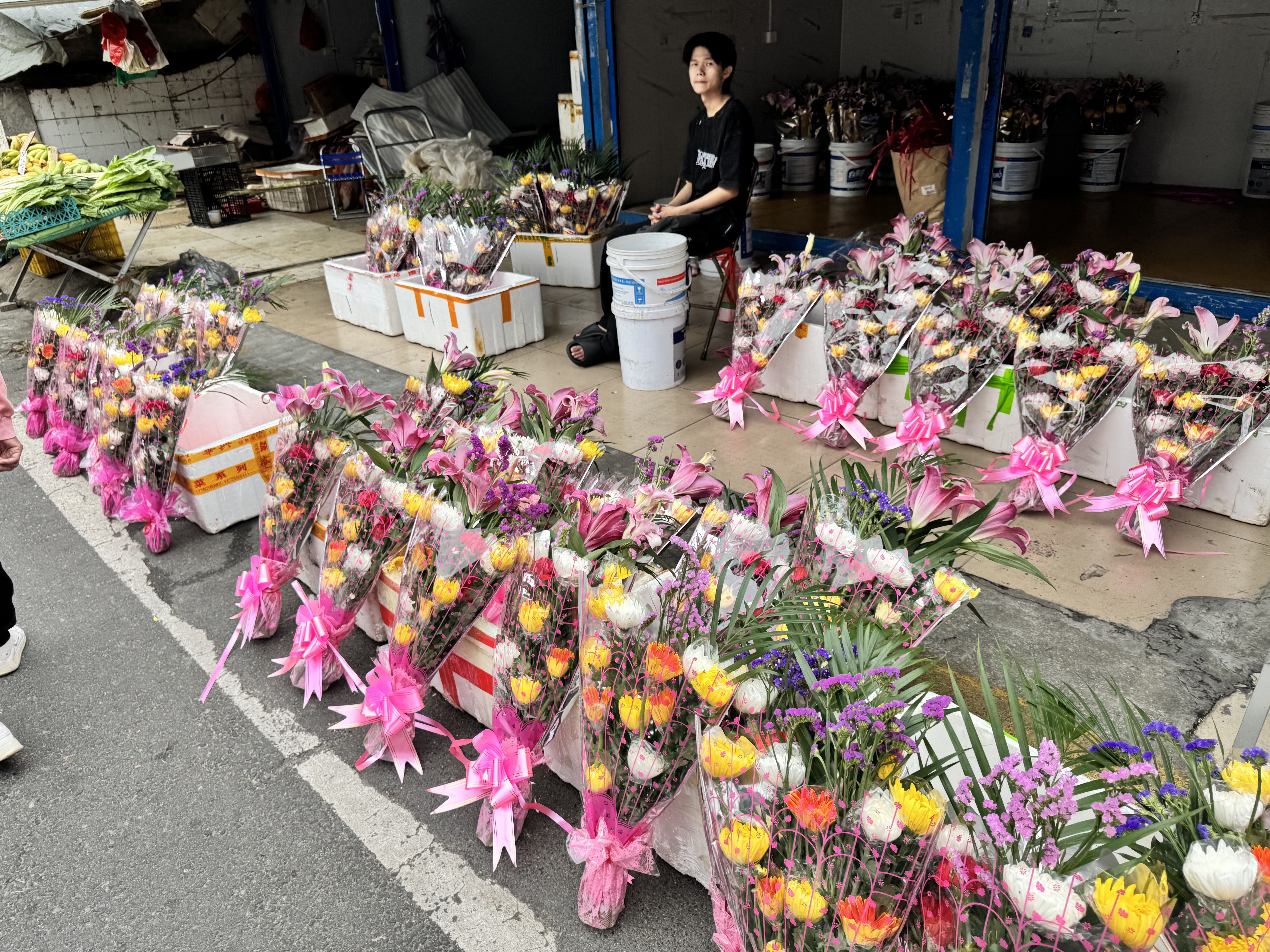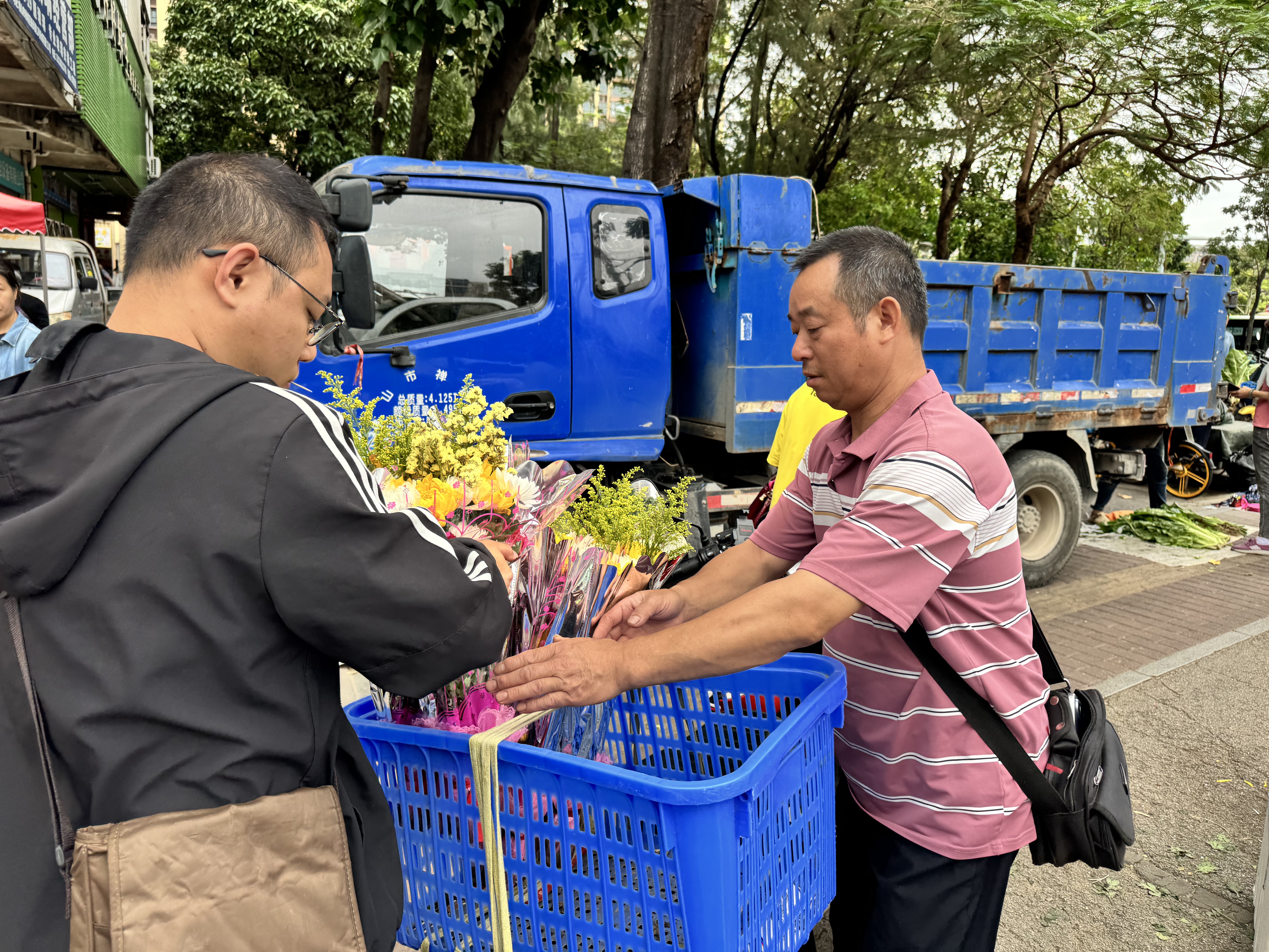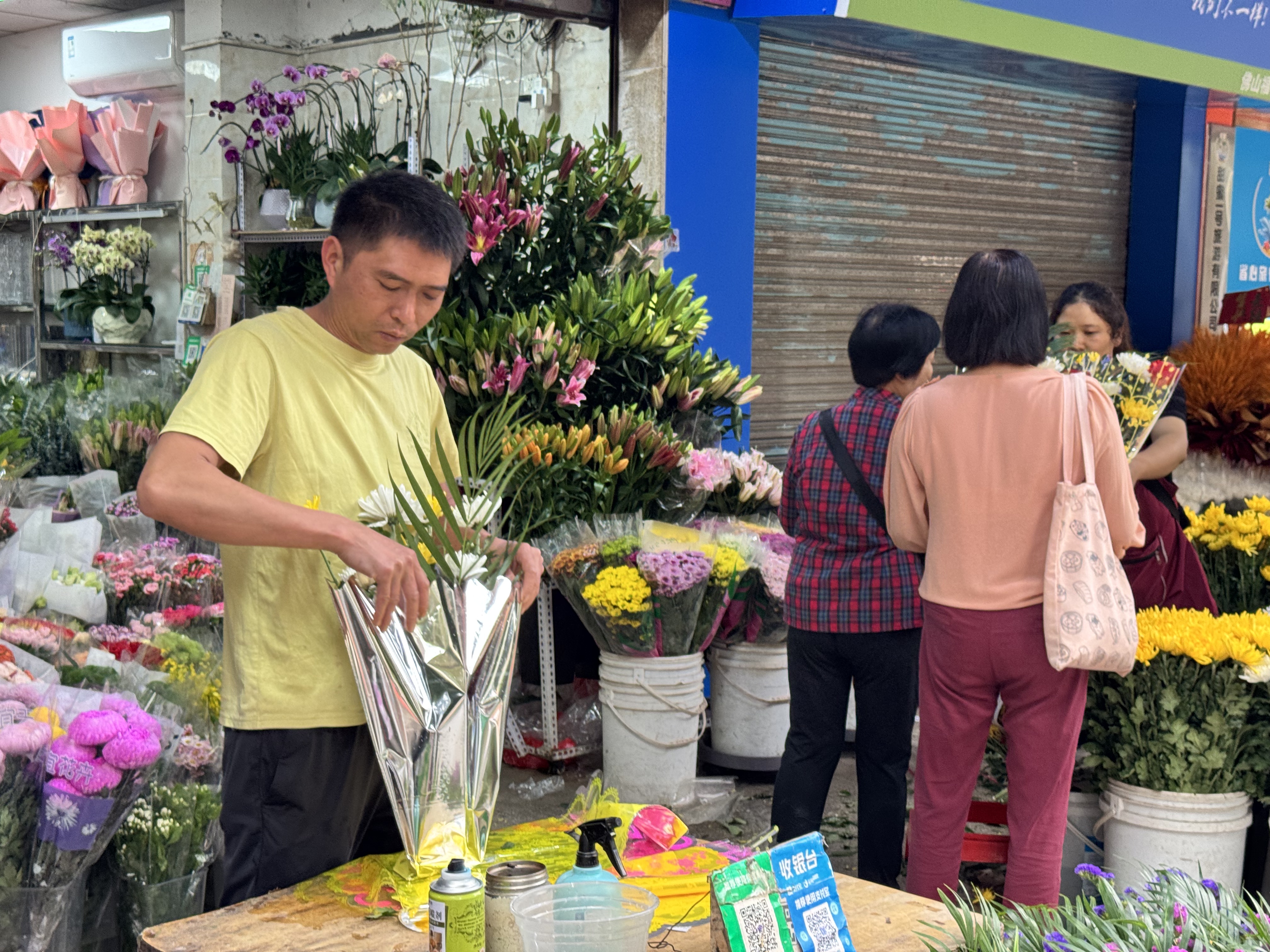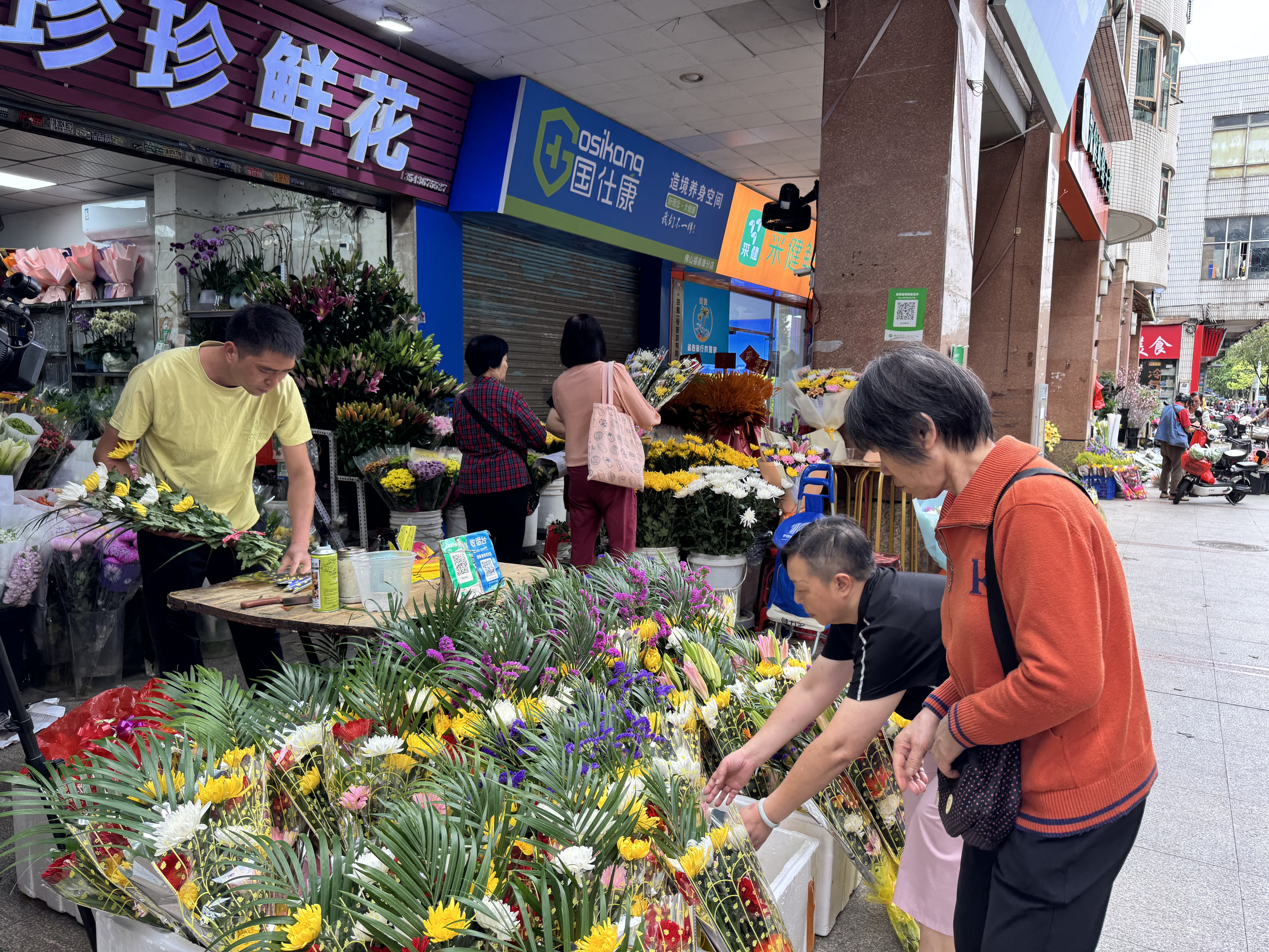而在另一边,花店老板施女士的摊位前,也围拢了早早赶来的人们。她的手指翻飞,正为一位客人加紧包扎最后几束花。“前天一早就开始准备了,一直在扎。要花新鲜,要大朵,要包得好看。”她深知,在这种特殊的节日客人的要求会格外“挑剔”,因为这不是普通的消费,而是一份不能马虎的心意。这份“挑剔”背后,是无比的郑重。