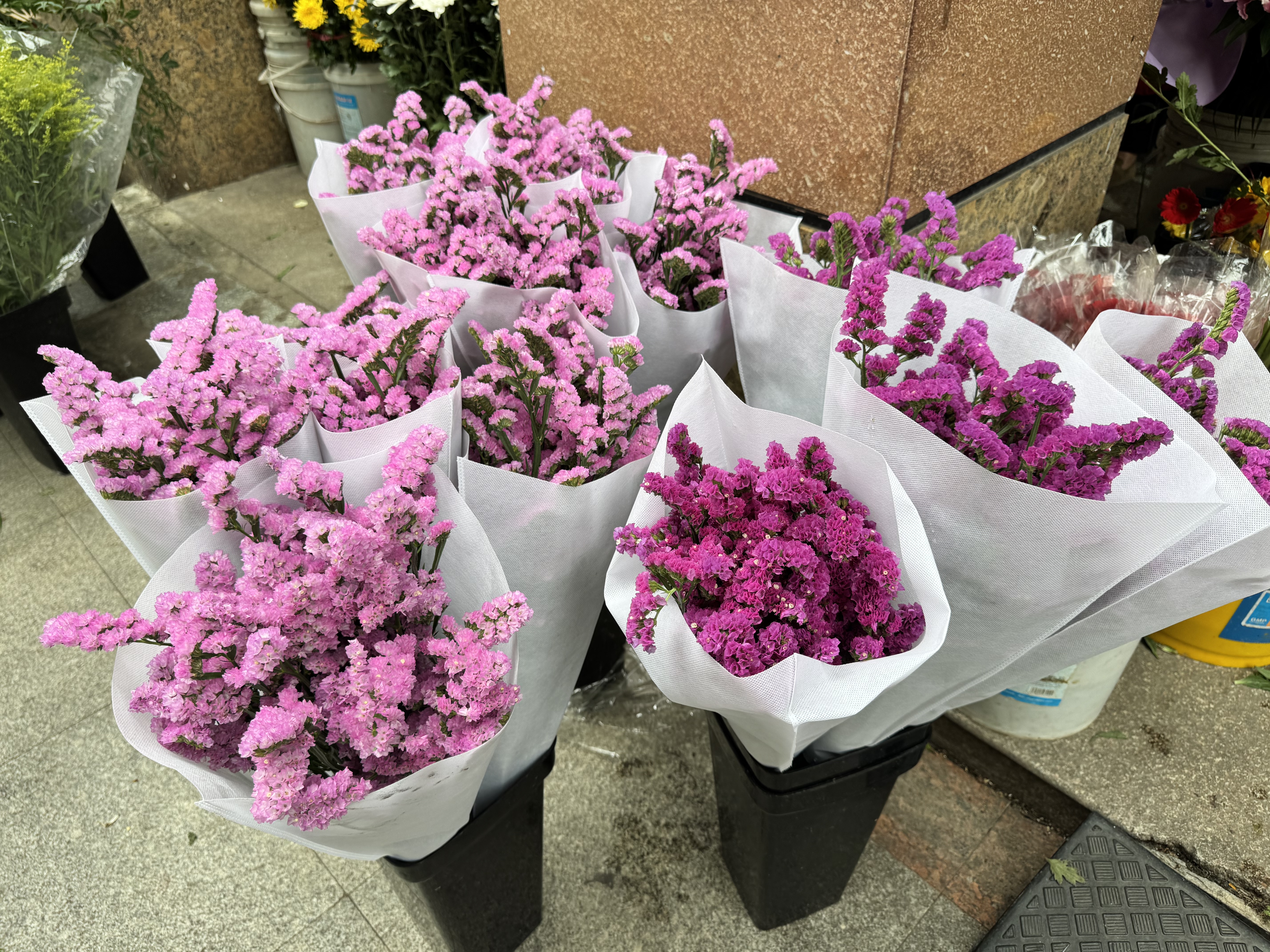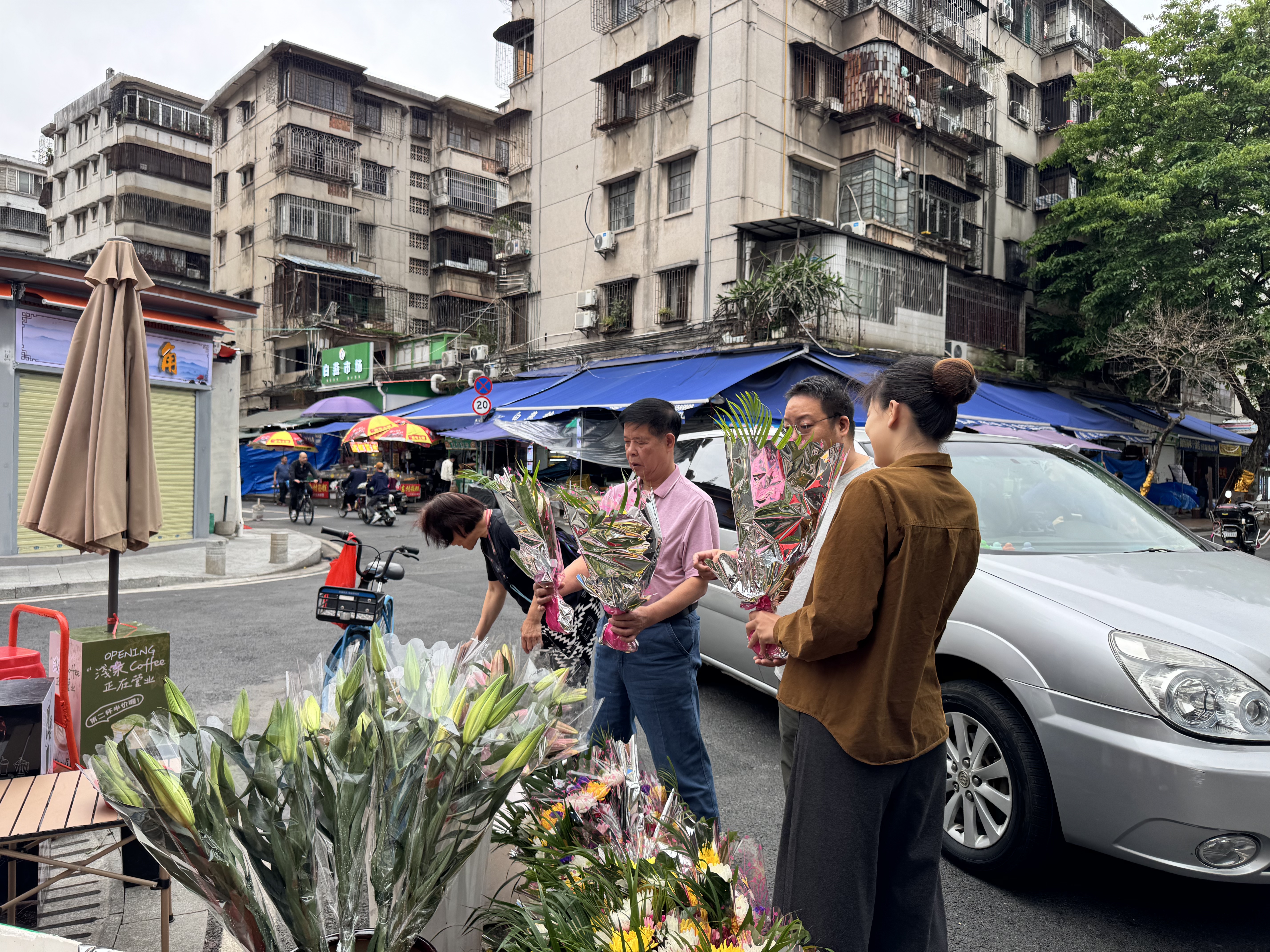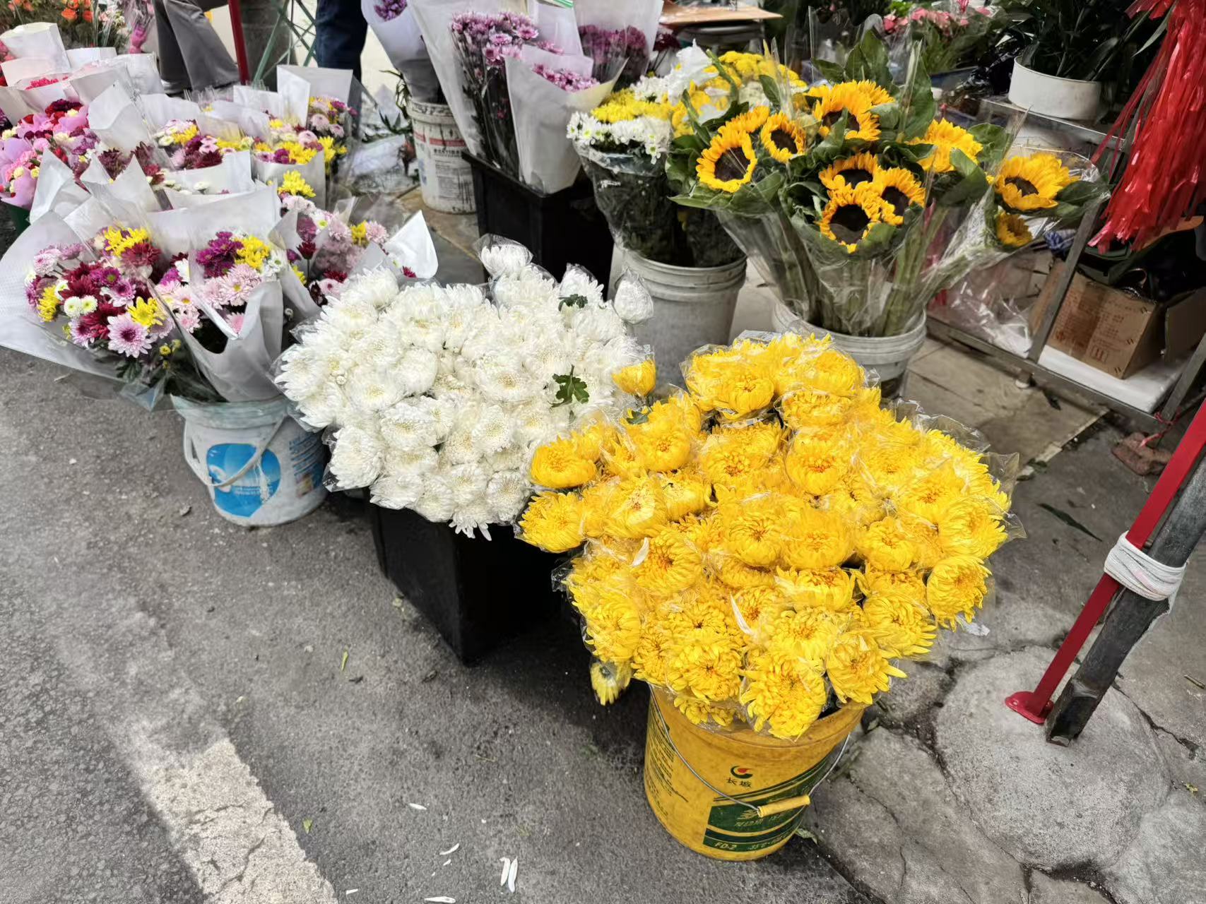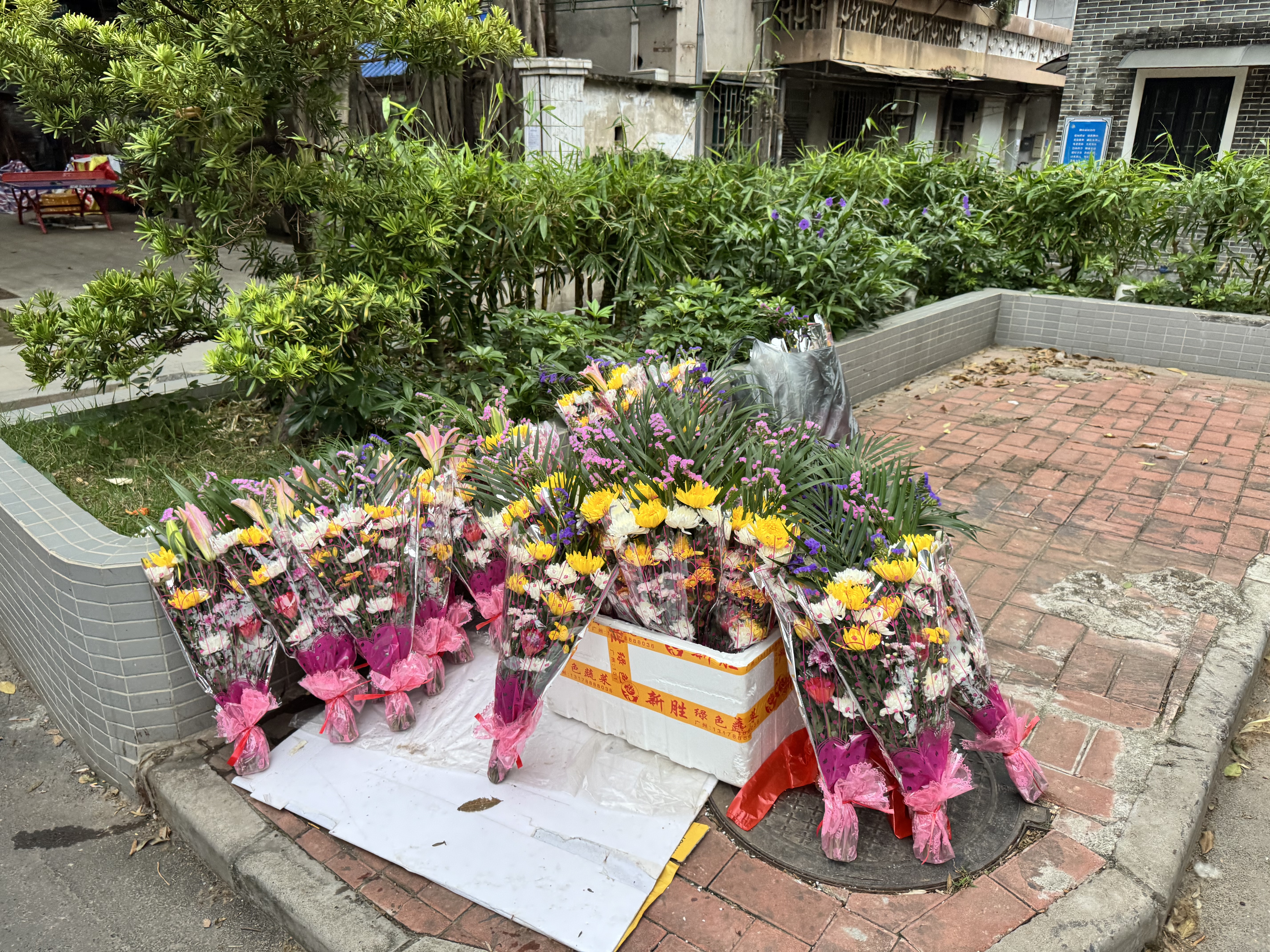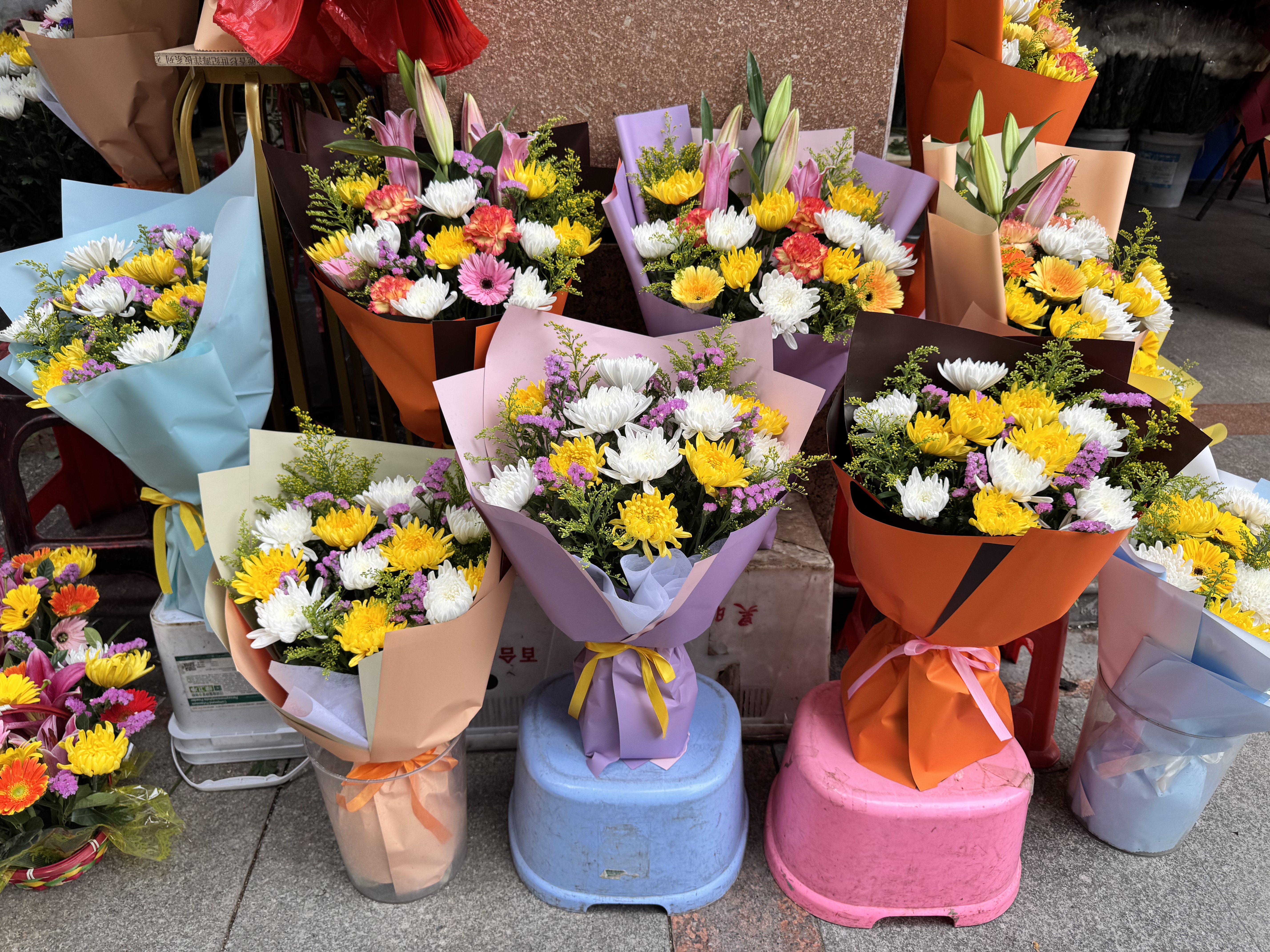 而在另一边,花店老板施女士的摊位前,也围拢了早早赶来的人们。她的手指翻飞,正为一位客人加紧包扎最后几束花。“前天一早就开始准备了,一直在扎。要花新鲜,要大朵,要包得好看。”她深知,在这种特殊的节日客人的要求会格外“挑剔”,因为这不是普通的消费,而是一份不能马虎的心意。这份“挑剔”背后,是无比的郑重。