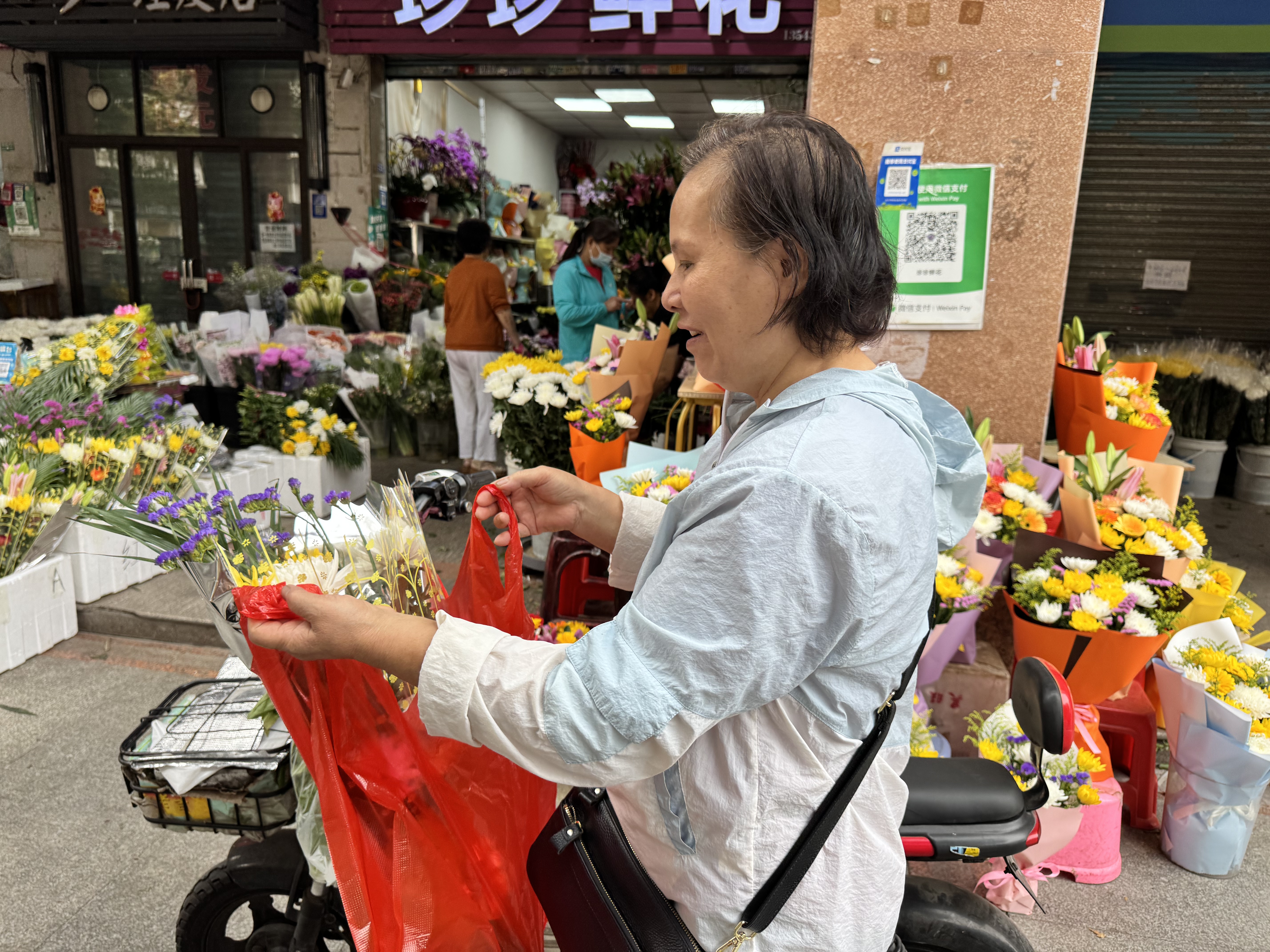 “一年一次,当然是选一束最靓的花去‘拜山’。”冼女士仔细地挑选着,眼神专注。对她而言,这已成为一个重要的仪式。“佛山每年很多人都是这样的,一家人都去。花要漂亮,心要诚。最重要的是......”她顿了顿,声音里带着全家人共同的念想,“大家都身体健康,出入平安。”