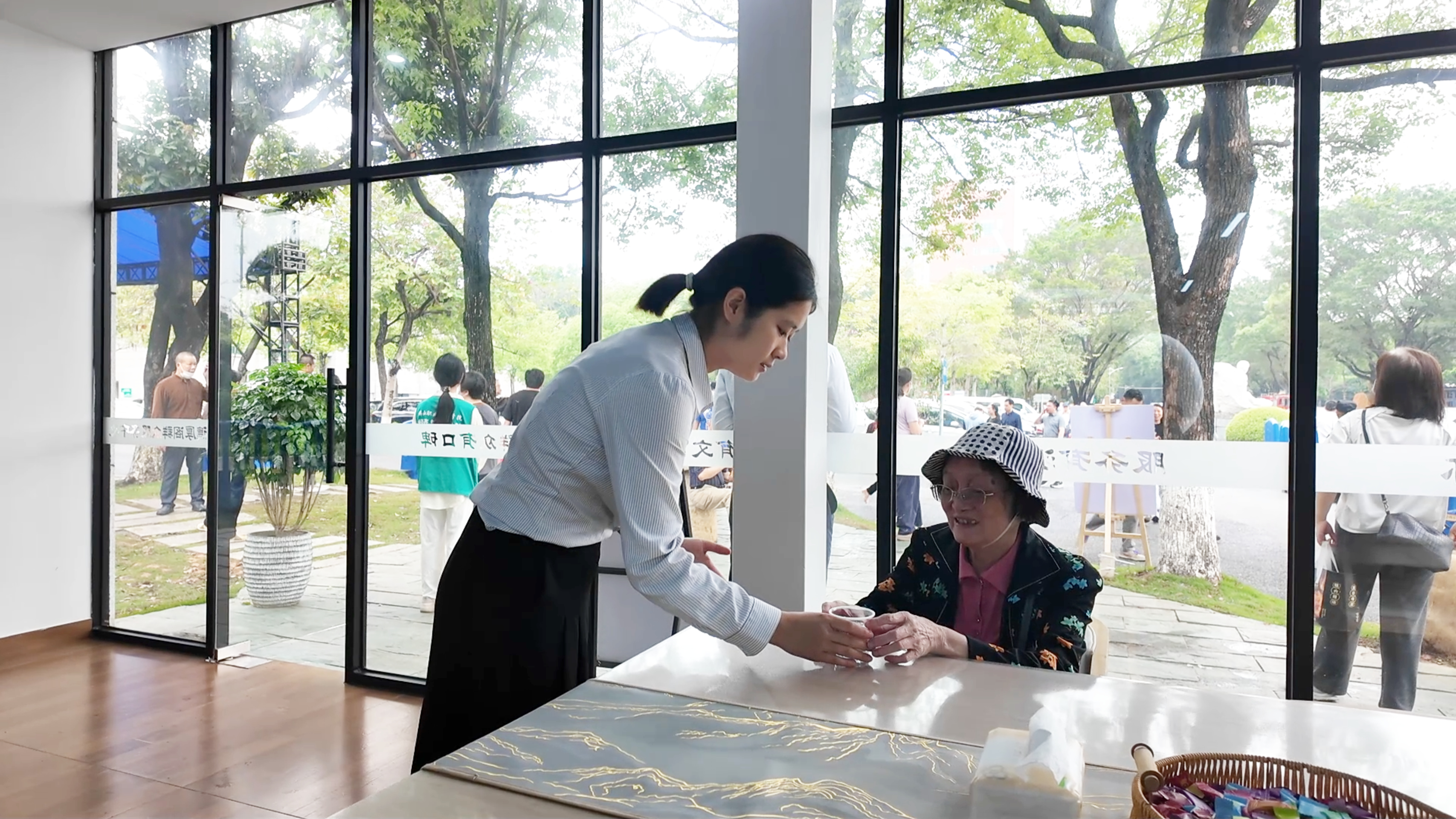 工作人员为林姨递上热水。
