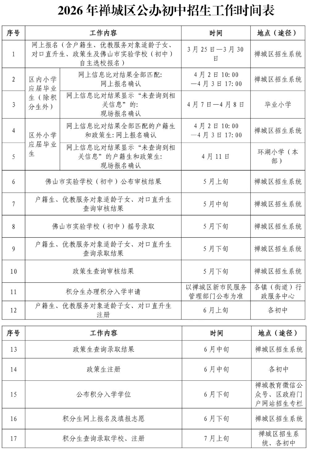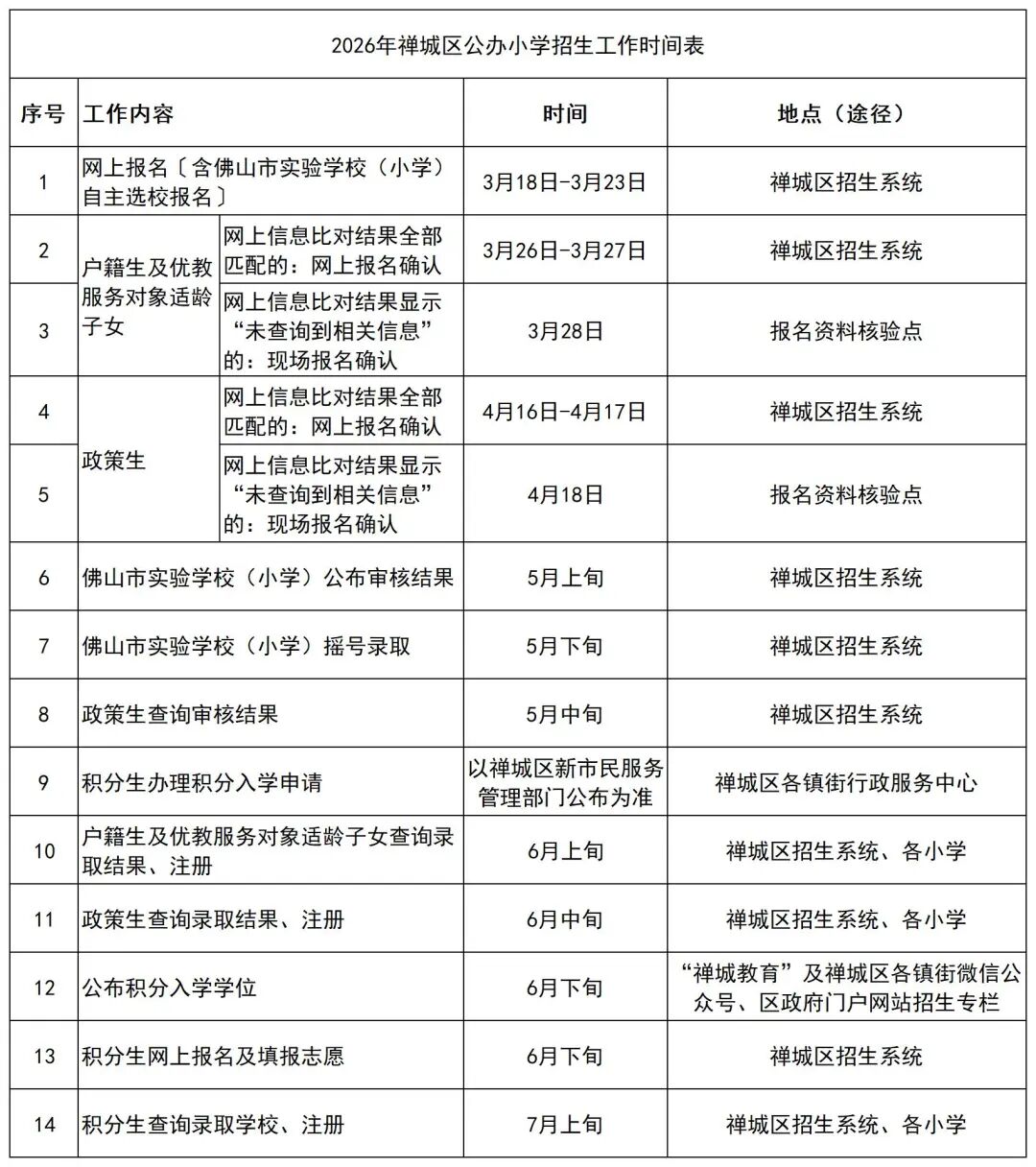 温馨提示:禅城区公办义务教育学校报名工作、户籍生报名确认工作已结束,禅城公办小学政策生报名确认时间为2026年4月16日-4月18日,请家长在规定时间内完成报名确认。
