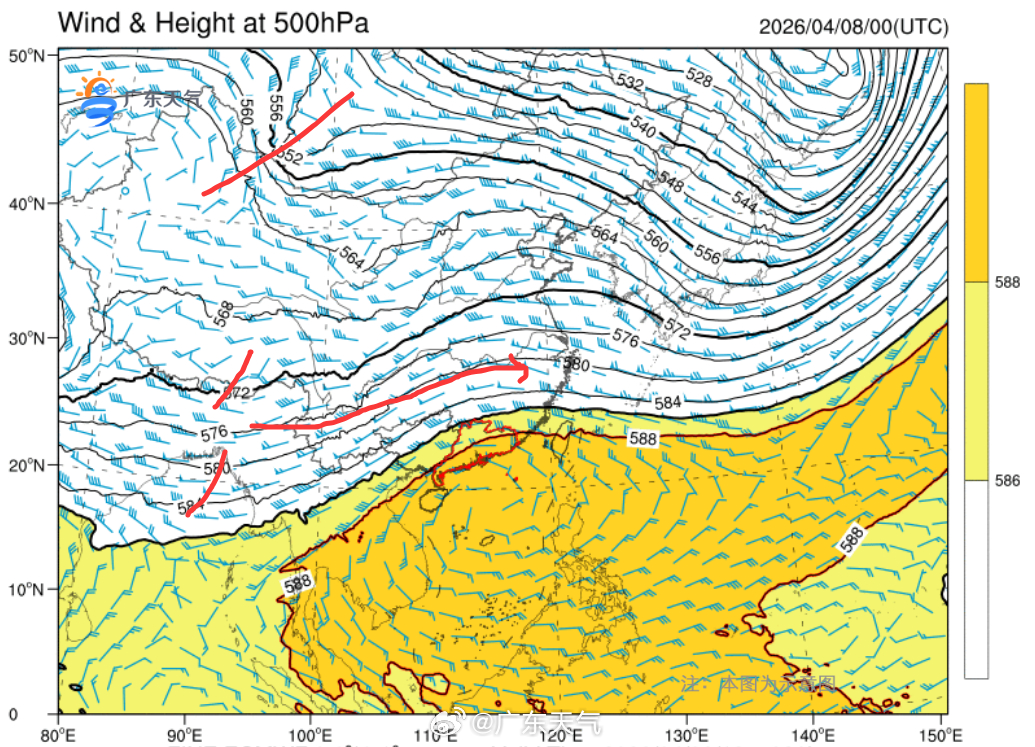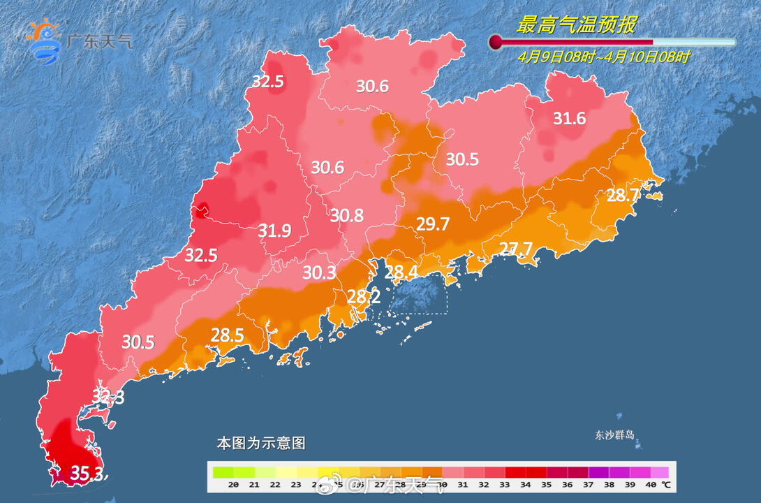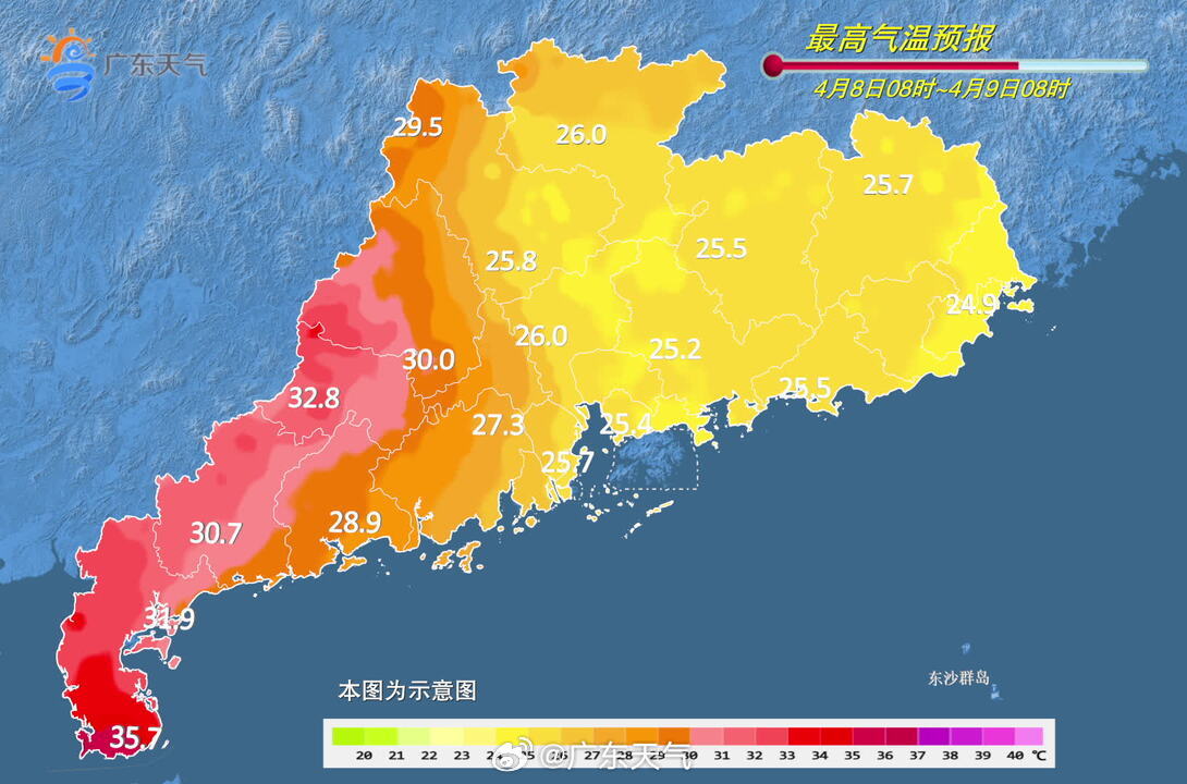广东省气象台4月7日预报,8日副热带高压加强西伸,广东仍处于南风通道,云量较多,省内中北部有分散小雨;9日至10日南风减弱,水汽条件下降,省内大部以多云天气为主,早晚有轻雾或雾,气温回升,其中雷州半岛最高气温可达34℃~36℃。