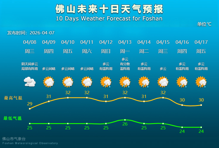 佛山市气象台4月7日预报,8日多云间阴天,局部有雷阵雨,气温25°C~29°C。9日至11日(周六)多云间晴,最高气温升至31°C~32°C。12日(周日)多云,有雷阵雨,气温25°C~31°C。展望13日至17日以多云为主,偶有雷阵雨,气温仍保持“3”字头。