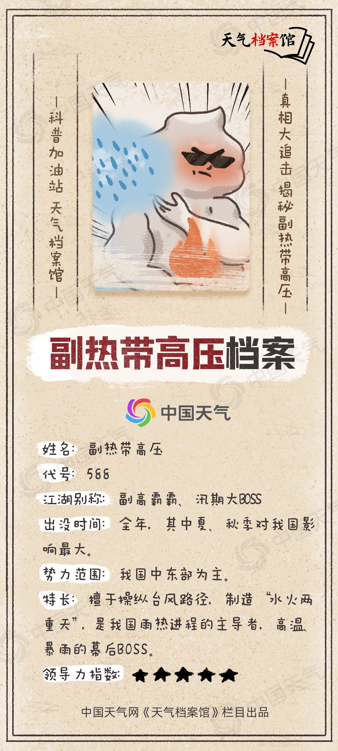 副热带高压又称副热带高压脊,常年在北半球副热带地区“称霸”,一般来说,每年冬季到夏季,副高会有规律地自南向北推移;从夏季到冬季,又有规律地自北往南撤退。夏季时主要盘踞在我国华南、江南、江淮、黄淮等地。