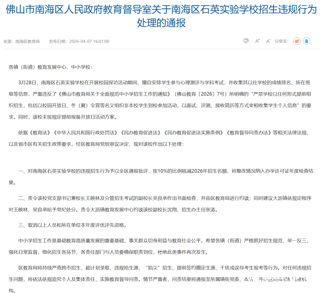 4月7日,佛山市南海区教育局发布《佛山市南海区人民政府教育督导室关于南海区石英实验学校招生违规行为处理的通报》(以下简称通报)。