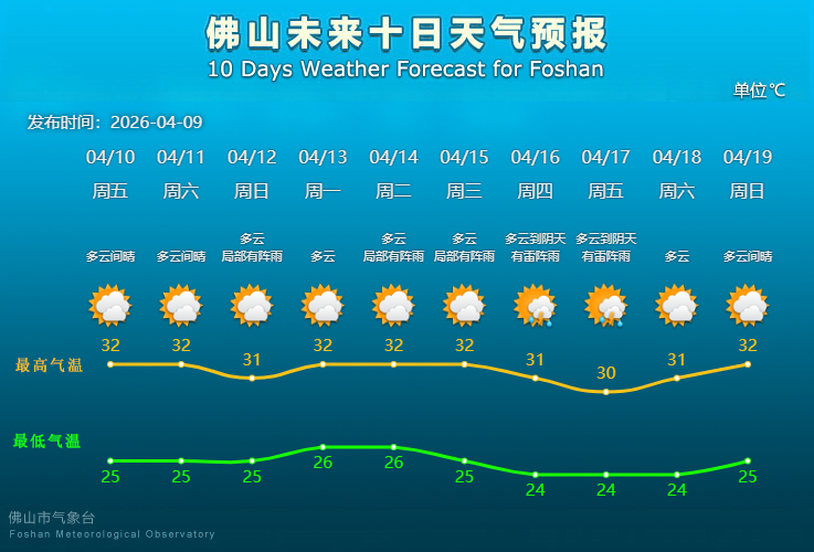 据佛山市气象台预测,4月13日起佛山云量增多,14日至17日局部有阵雨偷袭,最高气温稳定保持“3”字头,体感闷热潮湿。