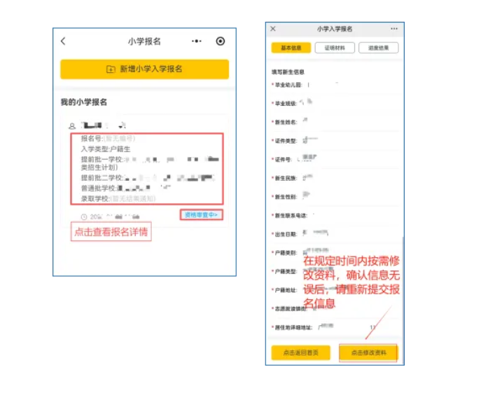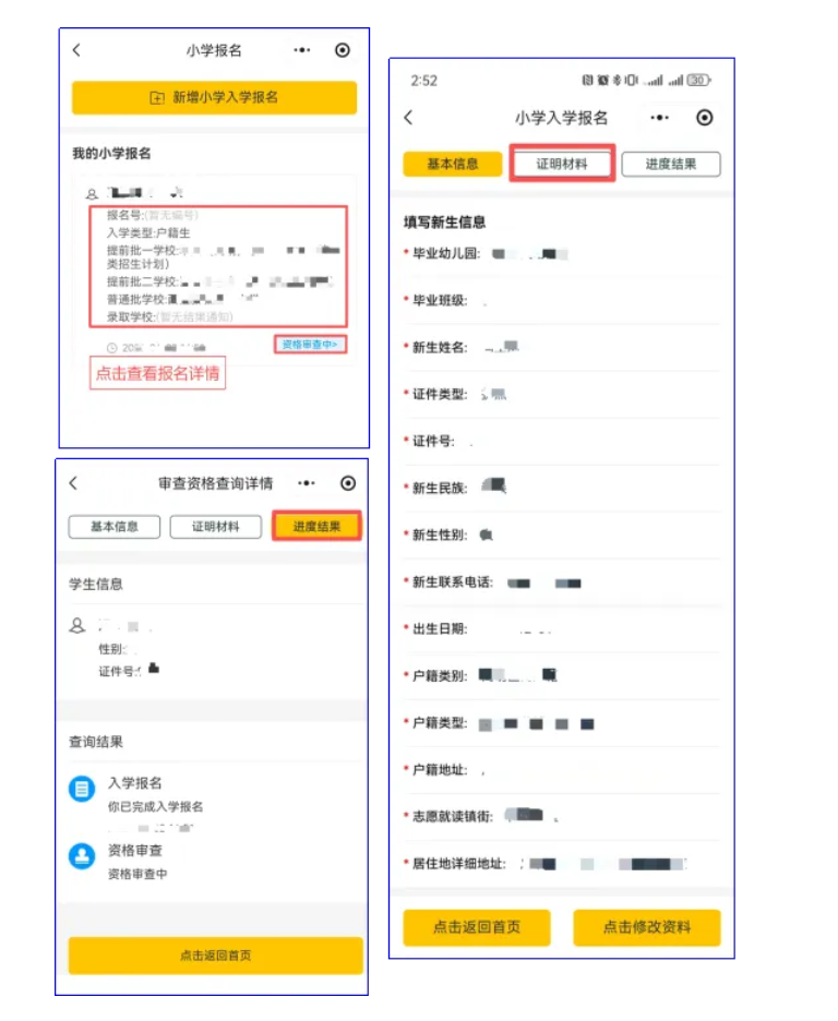 在“小学报名”或“初中报名”页面中,点击新生报名信息,即可查询当前报名记录(报名信息、证明材料、进度结果)。