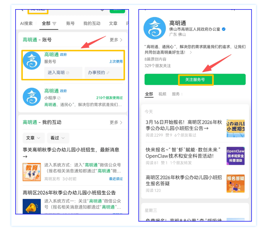 1)请各位家长持续关注“高明通”微信公众号,报名信息、资格审核结果、志愿信息及录取信息都将通过“高明通”微信公众号进行推送!