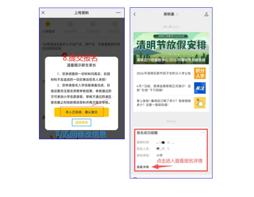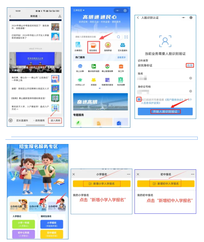 按照办法规定,适龄儿童少年家长可通过“高明通”和“高明教育”微信公众号菜单进入“高明区义务教育阶段招生报名系统”进行网上报名,报名时务必准确、真实填写报名信息,并选择报名的唯一身份。因误填、漏填报名信息而影响录取结果的,由报名本人承担一切后果。积分生无需在系统报名,请留意“佛山政法”、“高明教育”官方微信公众号公布的积分入学方案,按规定时间办理积分入学。