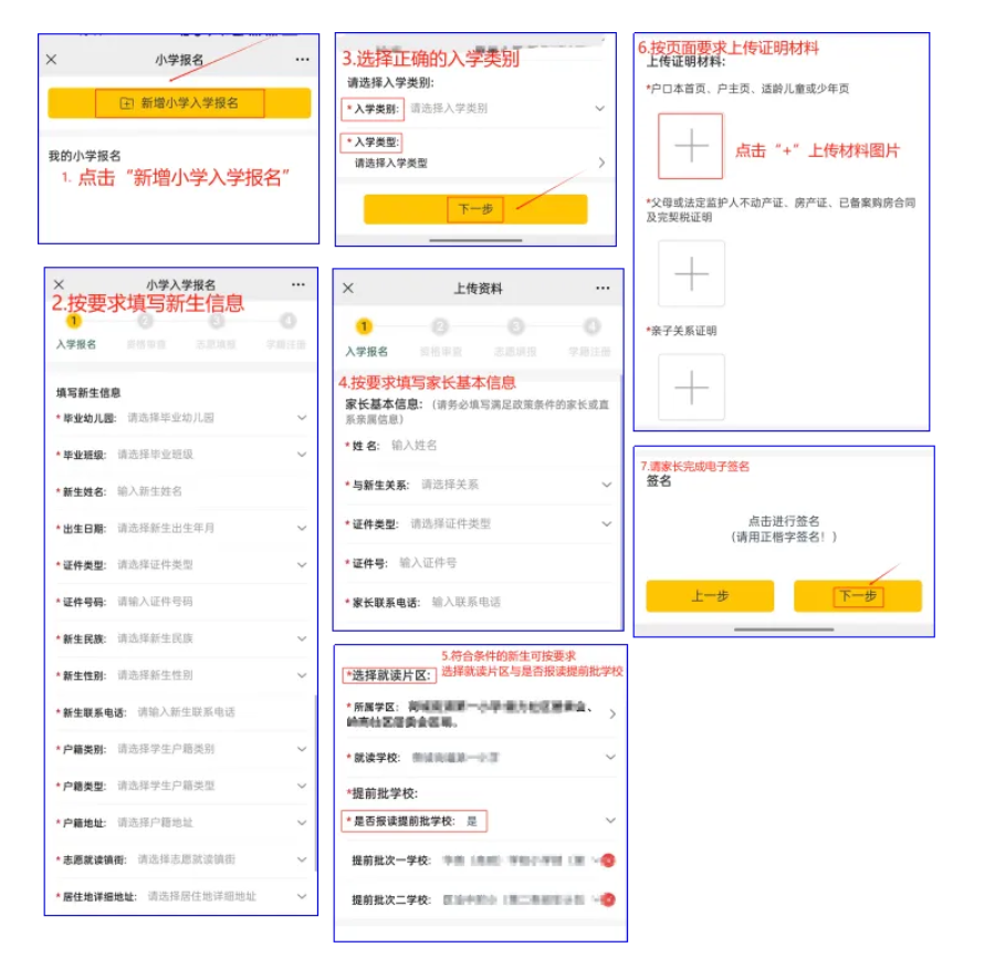5.根据入学类别与入学类型要求,符合条件的新生可选择就读片区与就读学校、可选择是否报读提前批学校与提前批一学校/二学校。